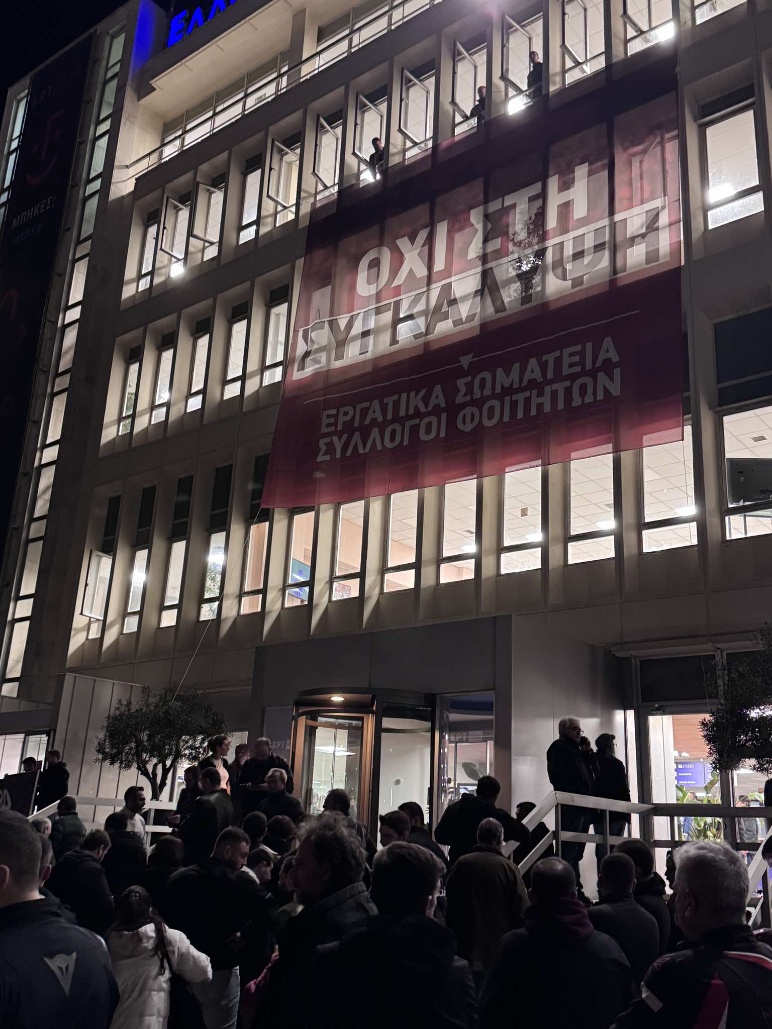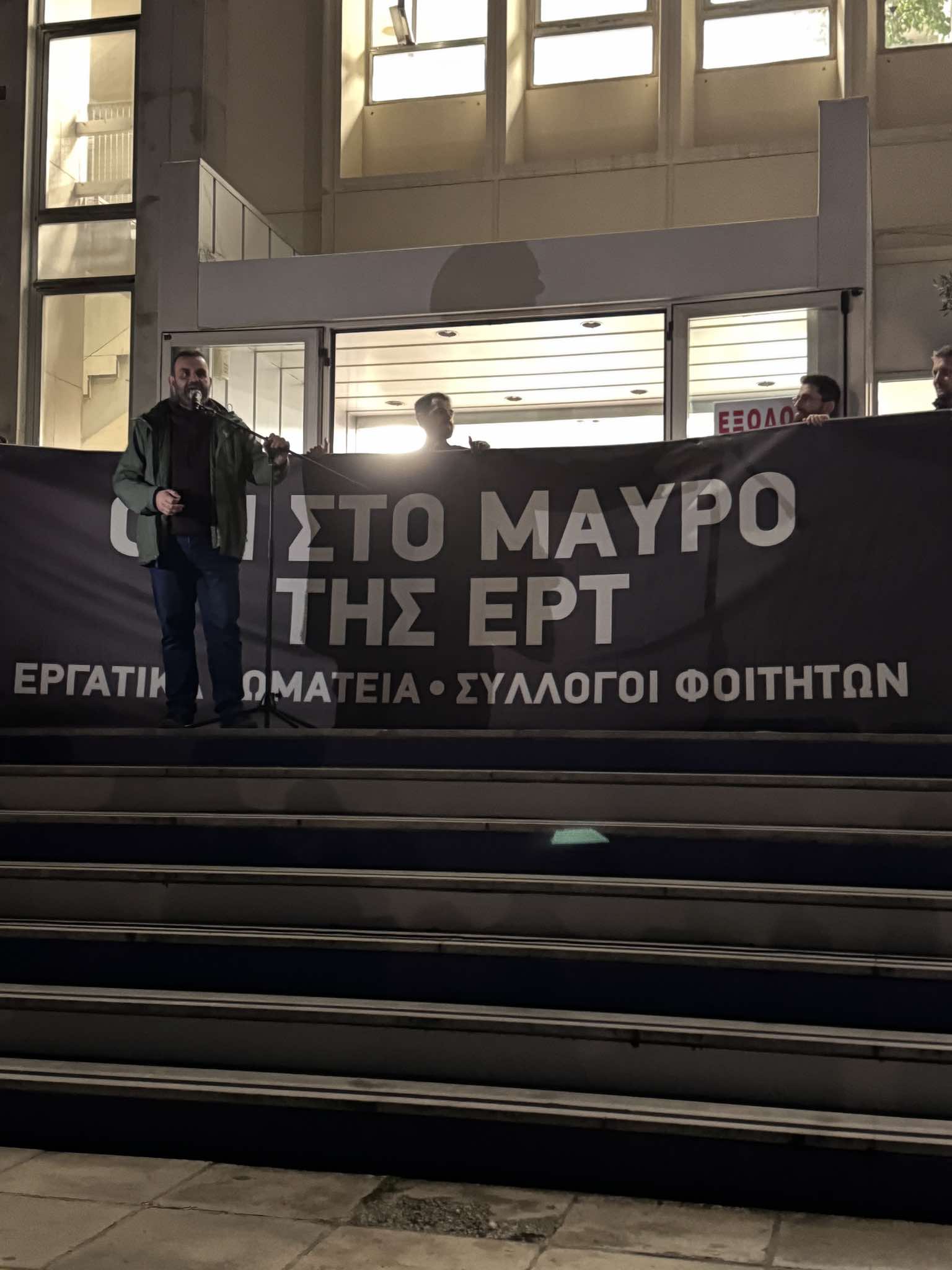 Ομάδα διαδηλωτών συγκεντρώθηκε το απόγευμα του Σαββάτου έξω από το κτήριο του Ραδιομεγάρου, στον προαύλιο χώρο της ΕΡΤ, προκειμένου να διαμαρτυρηθεί για τα Τέμπη.
