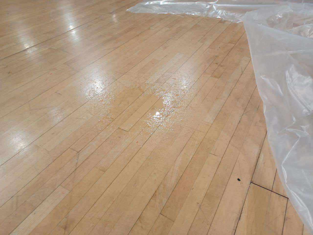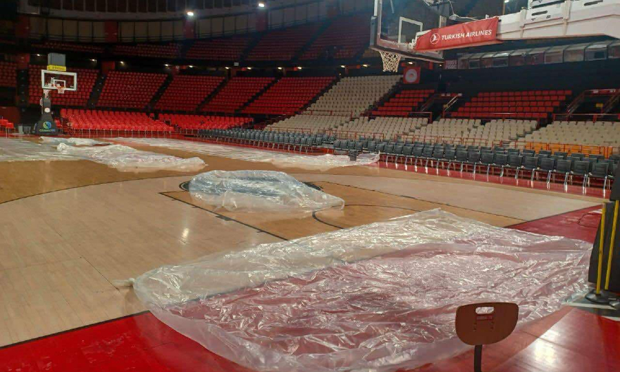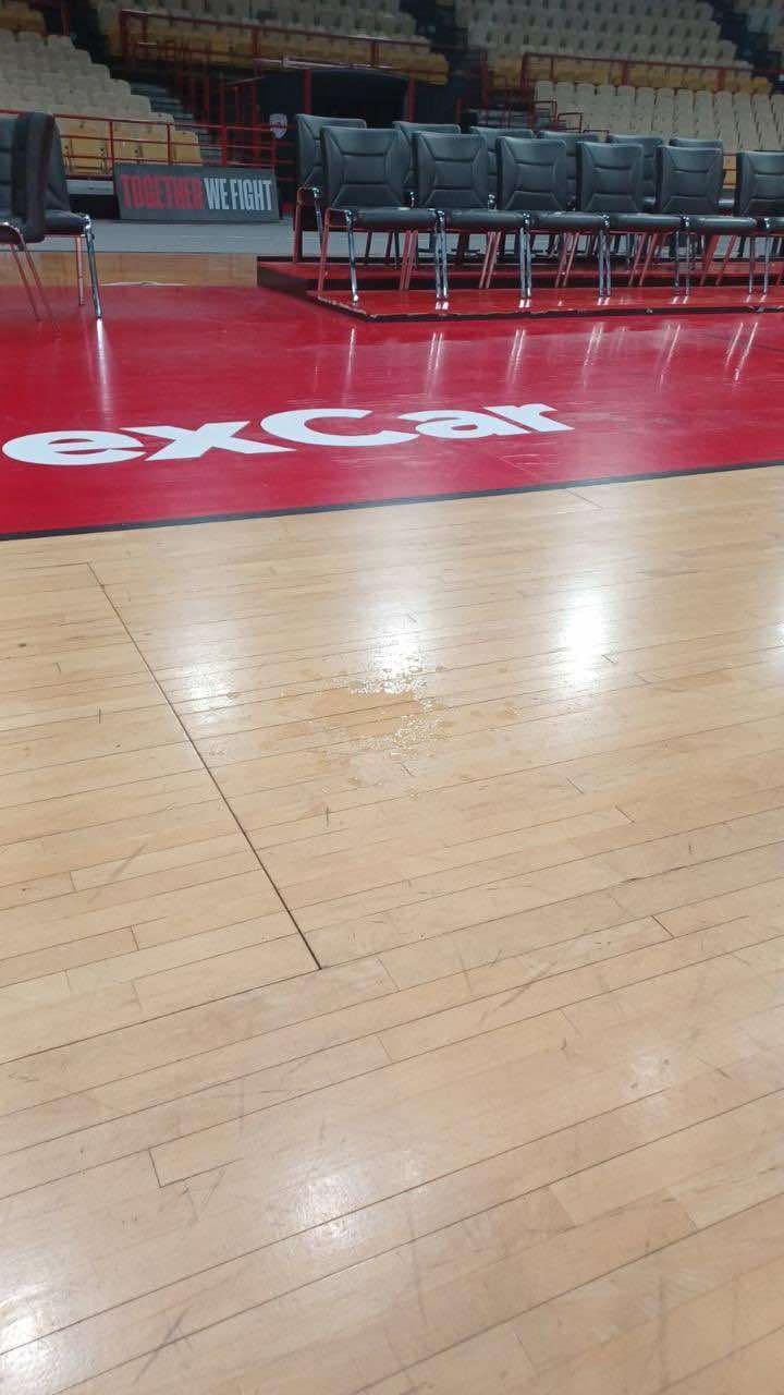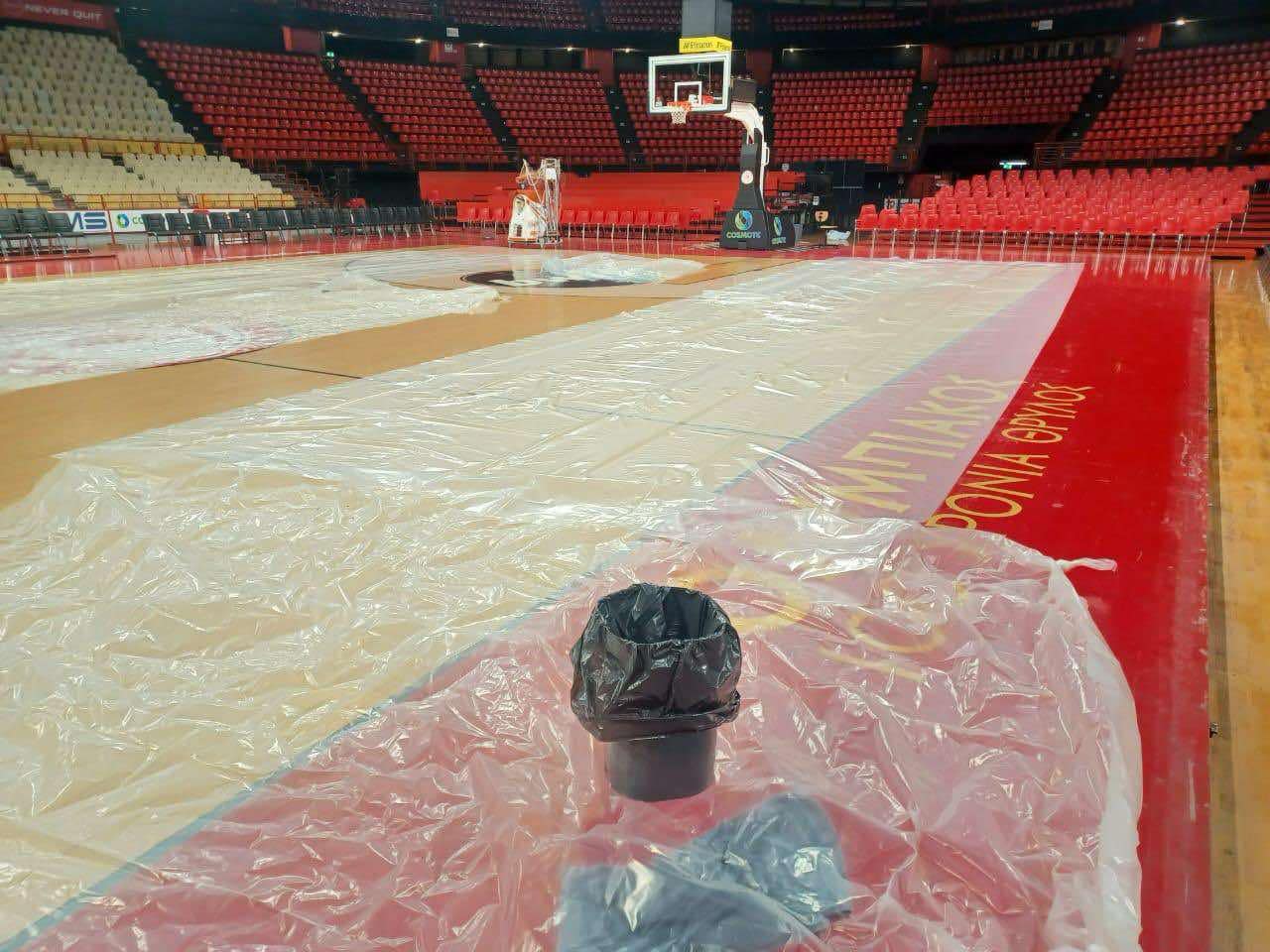 Για να αντιμετωπιστεί η κατάσταση, οι άνθρωποι του γηπέδου έχουν τοποθετήσει μουσαμάδες νάιλον στο παρκέ για να το καλύψουν και να μην φουσκώσει από τα νερά.