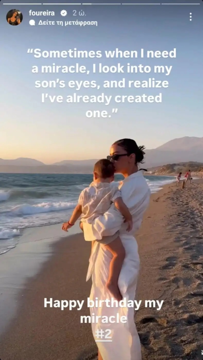 Στην ανάρτησή της η Ελένη Φουρέιρα δημοσίευσε μια φωτογραφία τους από την Κρήτη και έγραψε πως «μερικές φορές όταν χρειάζομαι ένα θαύμα, κοιτάω στα μάτια του γιου μου και συνειδητοποιώ ότι έχω ήδη δημιουργήσει ένα.