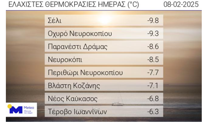 Πολύ χαμηλές ελάχιστες θερμοκρασίες σημειώθηκαν τις πρωινές ώρες του Σαββάτου 08/02 με τον υδράργυρο να πλησιάζει τους -10 βαθμούς Κελσίου. Η χαμηλότερη θερμοκρασία σημειώθηκε στο Σέλι με -9,8 °C.