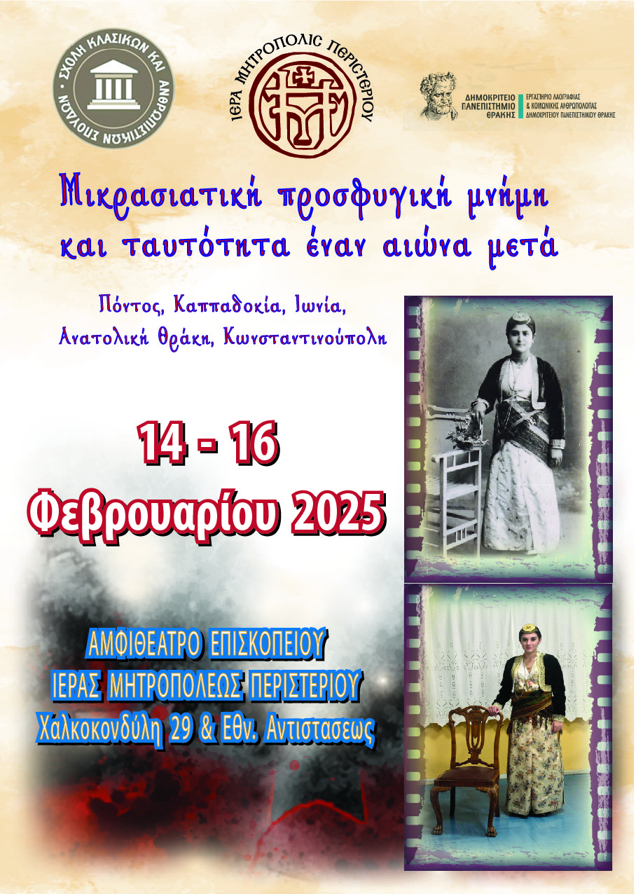 Η Σχολή Κλασικών & Ανθρωπιστικών Σπουδών και το Εργαστήριο Λαογραφίας & Κοινωνικής Ανθρωπολογίας του Δημοκρίτειου Πανεπιστημίου Θράκης, σε συνεργασία με την Ιερά Μητρόπολη Περιστερίου, συνδιοργανώνουν Διεθνές Συνέδριο με θέμα «Μικρασιατική προσφυγική μνήμη και ταυτότητα έναν αιώνα μετά | Πόντος, Καππαδοκία, Ιωνία, Ανατολική Θράκη, Κωνσταντινούπολη».