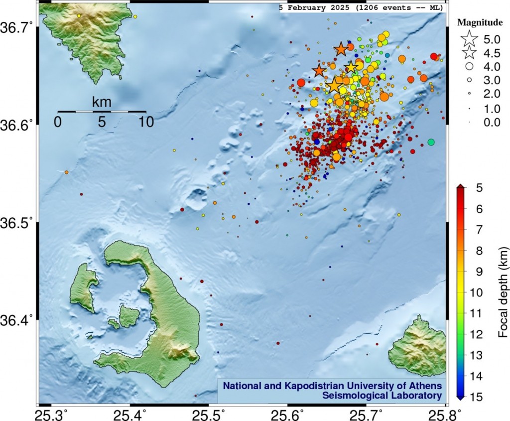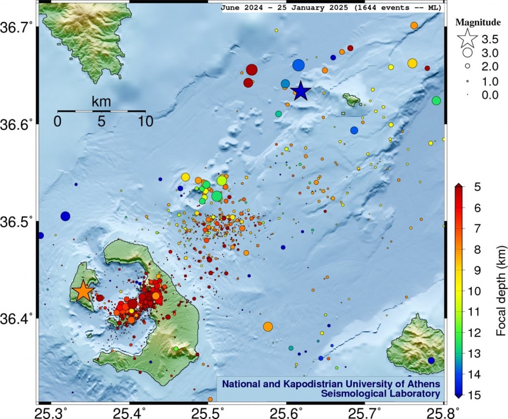 Κατά τη σεισμική ακολουθία του 2024, τα μικροσεισμικά επίκεντρα στη Σαντορίνη εντοπίστηκαν κυρίως στη Νέα Καμένη και την ευρύτερη περιοχή Ημεροβιγλίου – Φηρών, κατά μήκος της «γραμμής Καμένης» με διεύθυνση ΒΑ-ΝΔ. Συγχρόνως, εμφανίστηκε μικροσεισμική δραστηριότητα στην περιοχή ανατολικά του Κολούμπο, η οποία είχε ενεργοποιηθεί και κατά την περίοδο 2011-2012. Συνολικά, από τον Ιούνιο του 2024 έως και τις 25 Ιανουαρίου 2025 εντοπίστηκαν με τη χρήση τεχνητής νοημοσύνης πάνω από 1,600 σεισμοί στην περιοχή Σαντορίνης-Κολούμπο (Σχήμα 2), με μεγαλύτερο εκείνον που εκδηλώθηκε στις 25 Ιανουαρίου, 08:57:25 ώρα Ελλάδος, με επίκεντρο στις NA ακτές της Θηρασιάς, με μέγεθος 3.8.