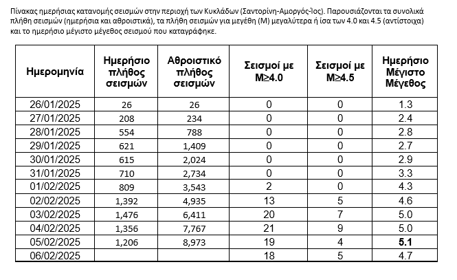 Σύμφωνα με τα στοιχεία καθημερινής ανάλυσης σεισμικών δεδομένων του Εργαστηρίου Σεισμολογίας του ΕΚΠΑ, κατά την 6η Φεβρουαρίου έχουν καταγραφεί πάνω από 110 σεισμοί, εκ των οποίων 18 με μεγέθη M≥4.0 και 5 με Μ≥4.5, ενώ ο μεγαλύτερος σεισμός είχε μέγεθος 4.7, με τους περισσότερους σεισμούς να σημειώνονται νοτιοδυτικά της Ανύδρου, και ελάχιστους βορειοανατολικά. Τα στοιχεία των τελευταίων ημερών δείχνουν ότι, αν και συνεχίζει να εμφανίζεται μεγάλο πλήθος σεισμών με Μ³4.0, ο ρυθμός σεισμικότητας παρουσιάζει μια σχετική μείωση, ως προς τους σεισμούς που εντοπίζονται τόσο με συμβατικές μεθόδους όσο και με μεθόδους τεχνητής νοημοσύνης.