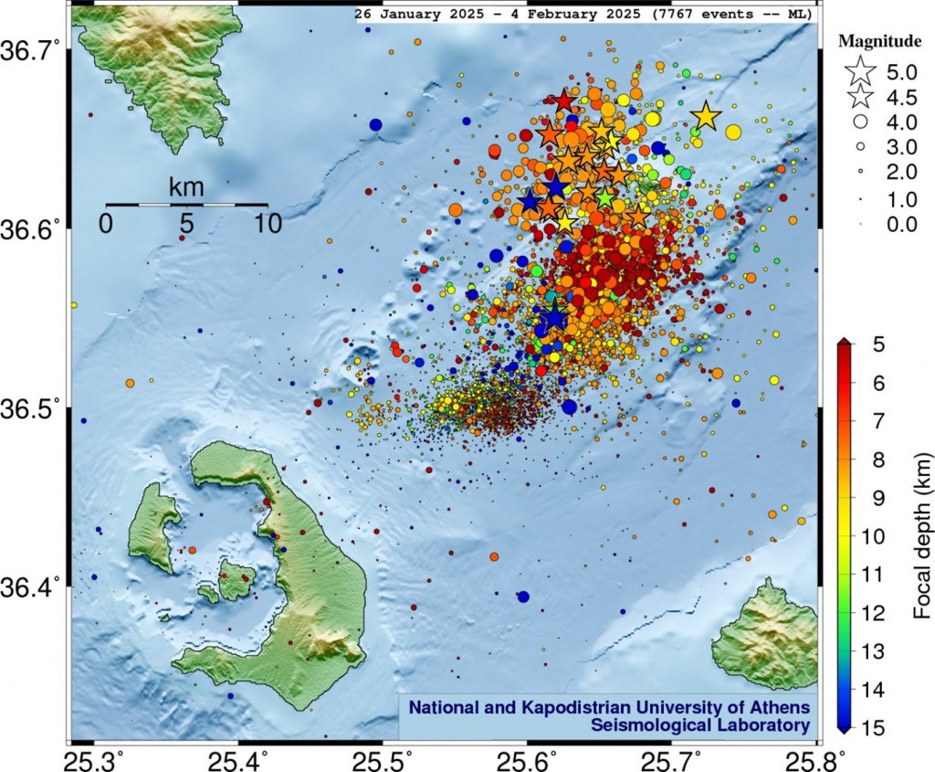Χάρτης κατανομής σεισμών στην περιοχή των Κυκλάδων (Σαντορίνη – Αμοργός – Ίος) οι οποίοι εντοπίστηκαν με τη χρήση τεχνητής νοημοσύνης κατά την περίοδο 26 Ιανουαρίου – 4 Φεβρουαρίου 2025. Η ακτίνα των κύκλων είναι ανάλογη του μεγέθους του σεισμού (υπόμνημα επάνω-δεξιά), ενώ τα επίκεντρα σεισμών μεγέθους Μ³4.5 σημειώνονται με αστέρι. Ο χρωματισμός ανταποκρίνεται στο εστιακό βάθος, σύμφωνα με τη χρωματική κλίμακα (δεξιά). Πηγή: ΕΚΠΑ