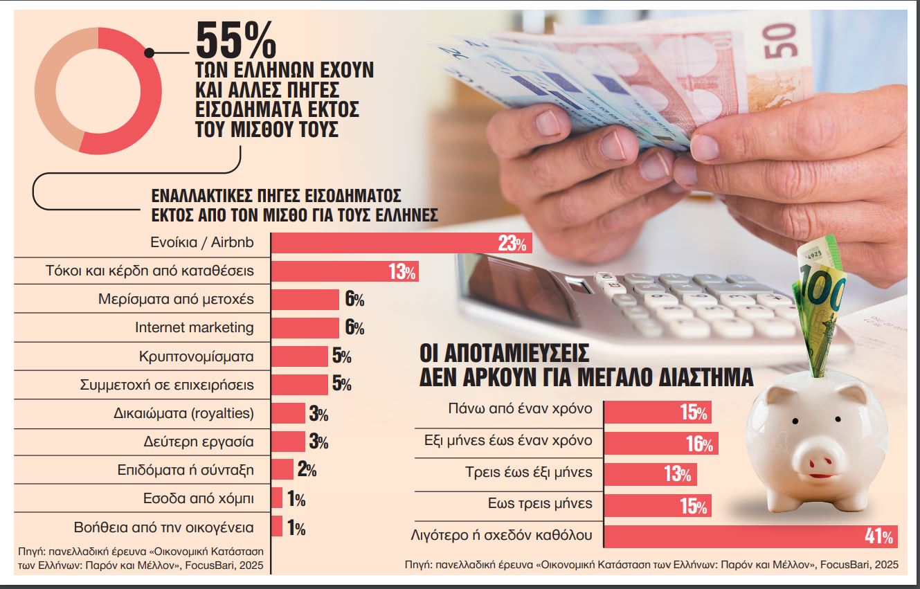 Νέα πραγματικότητα για πάνω από τους μισούς Ελληνες είναι η αναζήτηση εναλλακτικών πηγών εισοδημάτων και αυτό γιατί ο ένας μισθός ή η σύνταξη δεν φτάνει για να βγάλουν τον μήνα.