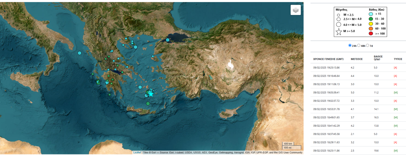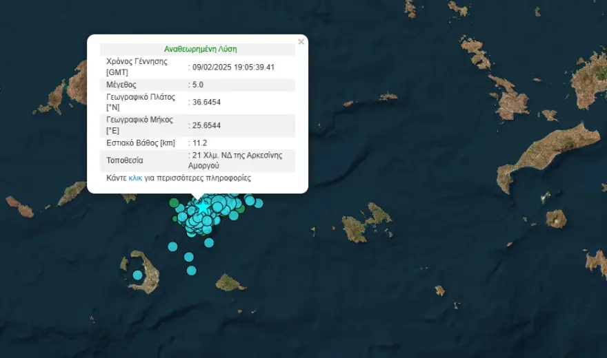«Ανακοίνωση σεισμού της 09/02/2025: Εκ μέρους των τεσσάρων φορέων συγκρότησης του Ενιαίου Εθνικού Σεισμολογικού Δικτύου, το Γεωδυναμικό Ινστιτούτο του Εθνικού Αστεροσκοπείου Αθηνών ανακοινώνει ότι σήμερα, στις 21:05 ώρα Ελλάδος, το σεισμολογικό δίκτυο κατέγραψε Ισχυρή σεισμική δόνηση με μέγεθος 5.0 στην κλίμακα Richter. Ο σεισμός έγινε σε απόσταση 226 χλμ. ΝΑ των Αθηνών. Το επίκεντρο της δόνησης εντοπίζεται στο θαλάσσιο χώρο 21 χλμ. ΝΔ της Αρκεσίνης Αμοργού».