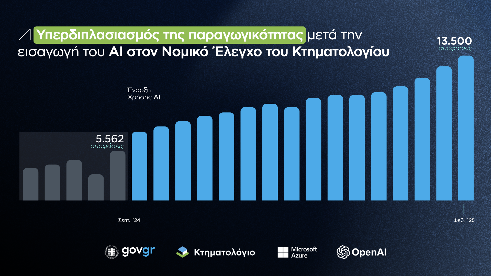 Υπογραμμίζεται ότι από τον Σεπτέμβριο του 2024, η παραγωγικότητα έχει υπερδιπλασιαστεί, ξεπερνώντας τον Φεβρουάριο τις 13.500 πράξεις ανά εβδομάδα, ενώ πριν την εφαρμογή του συστήματος ΤΝ ο Μ.Ο των νομικών ελέγχων ανά εβδομάδα ήταν στους 5.562. Παράλληλα, ο χρόνος διεκπεραίωσης μειώθηκε έως και 90% – από 1-2 ώρες σε μόλις 10 λεπτά – ενώ το κόστος έχει περιοριστεί κατά 99%, από 15 ευρώ σε μόλις 0,11 ευρώ. Η δραστική αυτή επιτάχυνση των ελέγχων και η μείωση του λειτουργικού κόστους οδηγούν σε αποτελεσματική εκκαθάριση των συσσωρευμένων εκκρεμοτήτων προηγούμενων ετών.