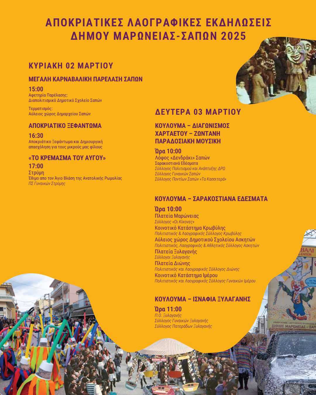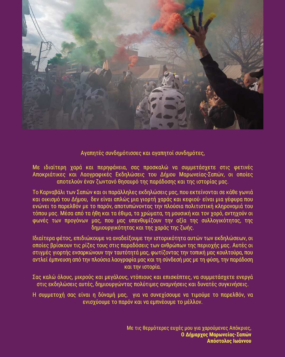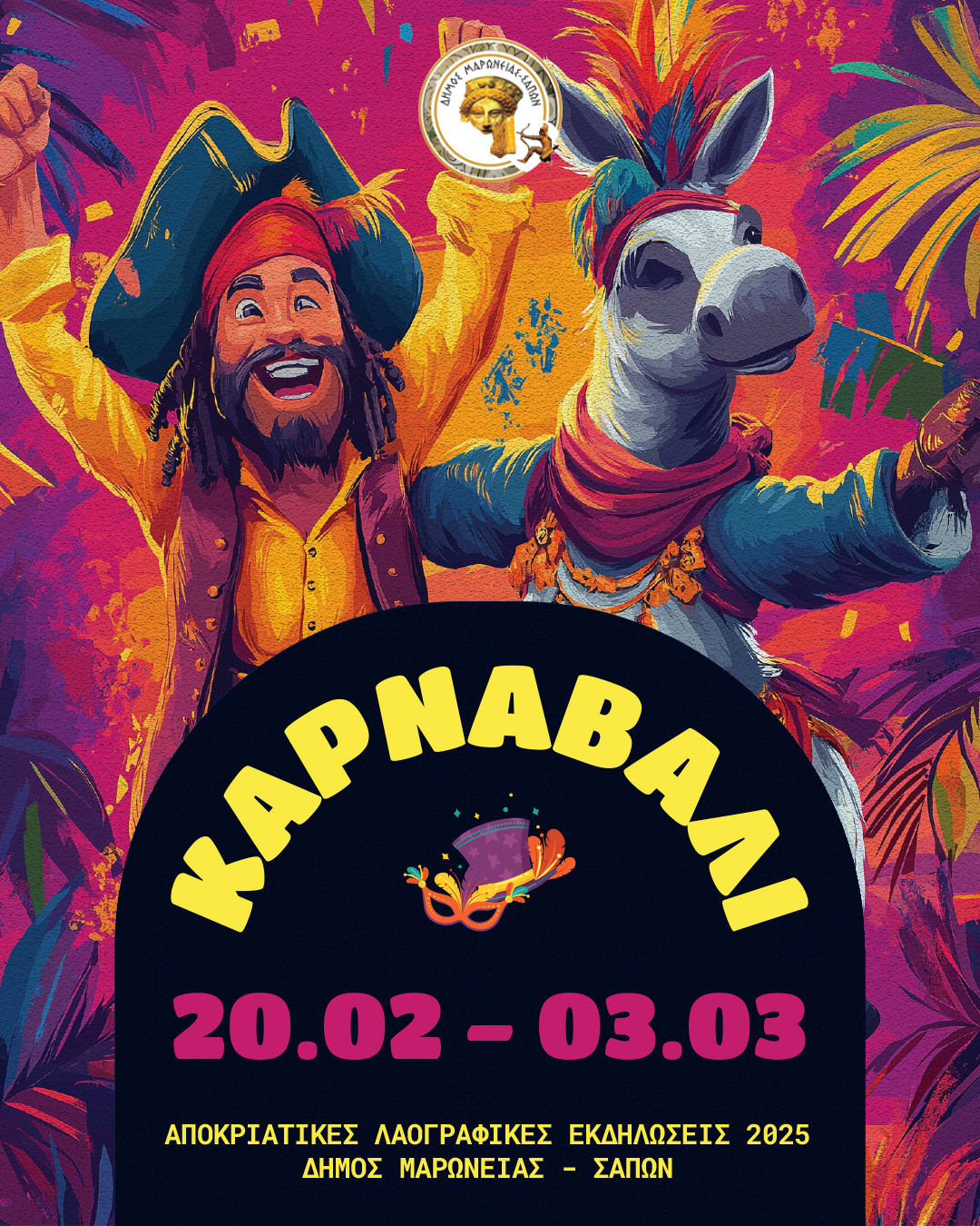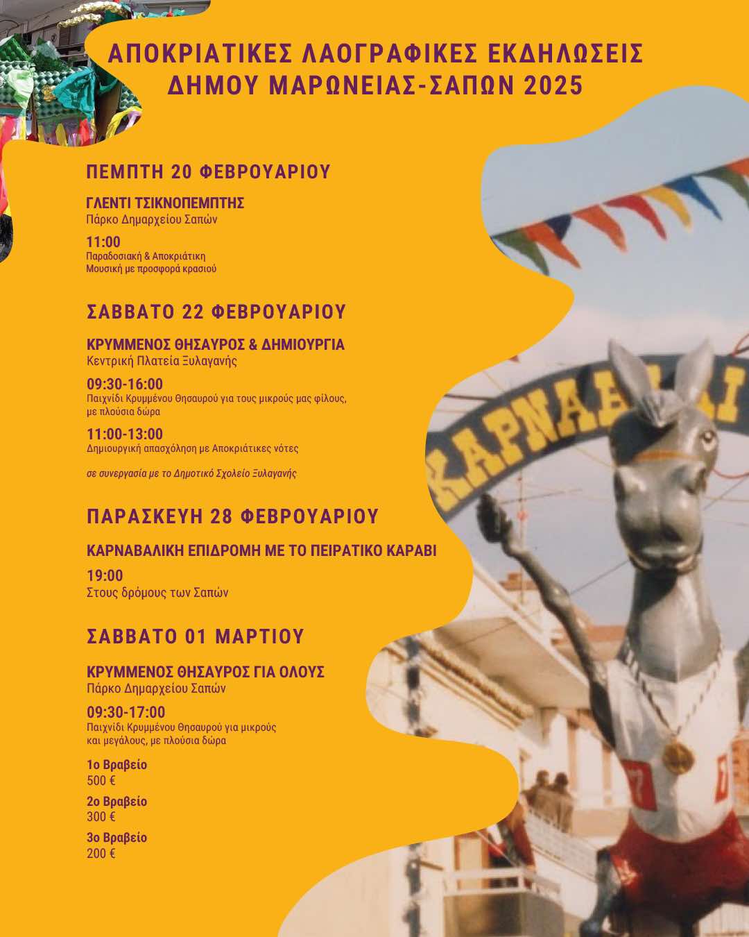 Το διάστημα από τις 20 Φεβρουαρίου έως και τις 3 Μαρτίου θα πραγματοποιηθούν οι φετινές λαογραφικές-αποκριάτικες εκδηλώσεις του Δήμου Μαρωνείας-Σαπών, που έχουν καταστεί θεσμός για την περιοχή.