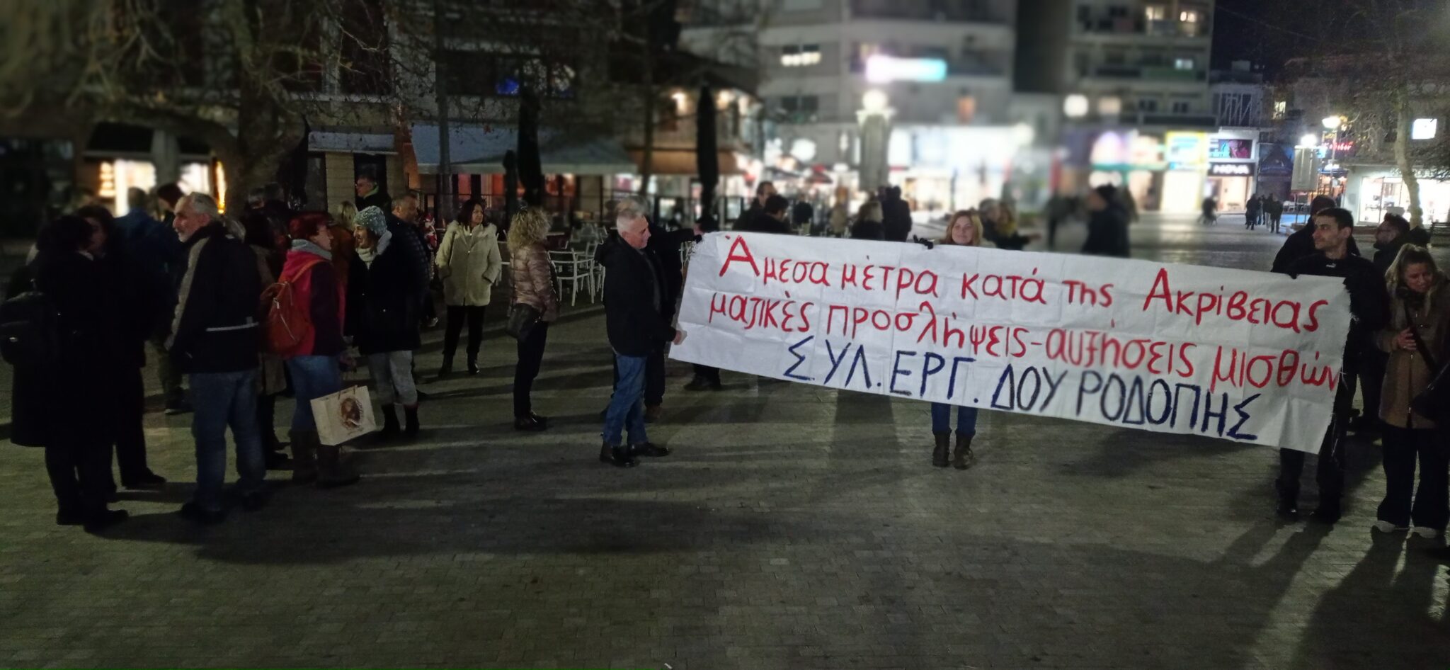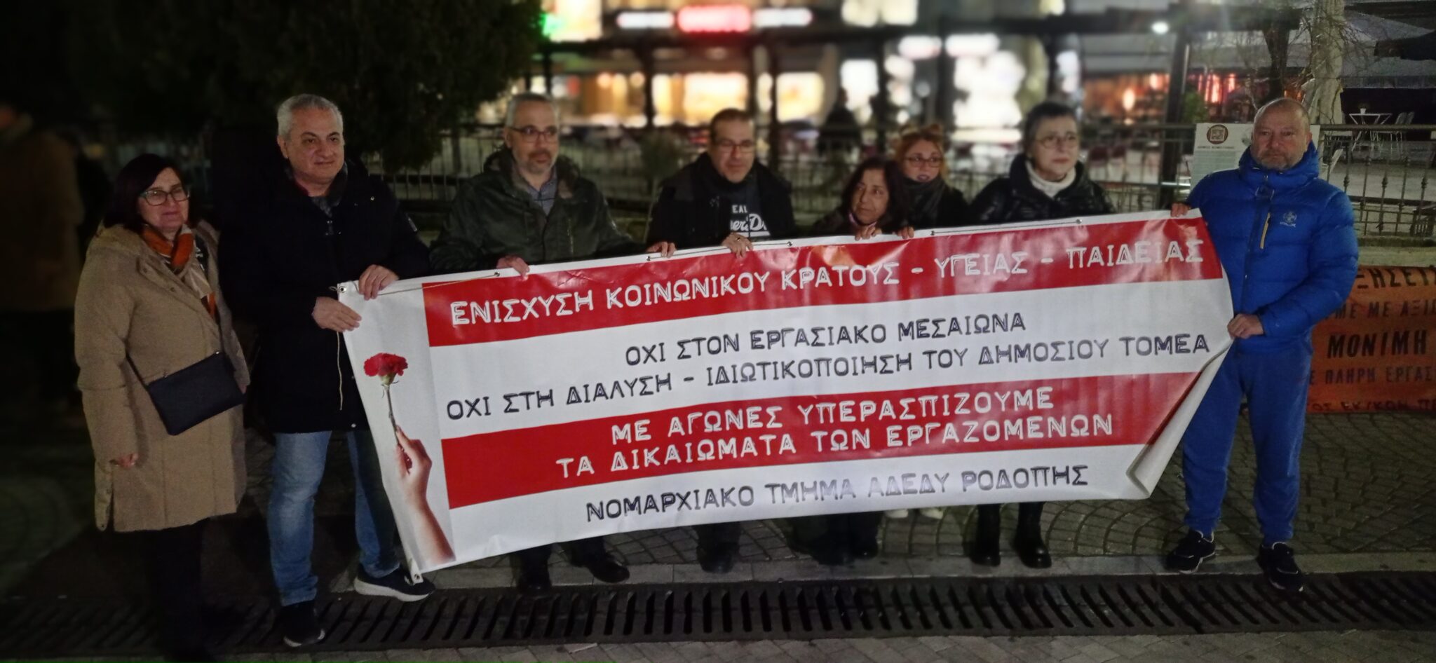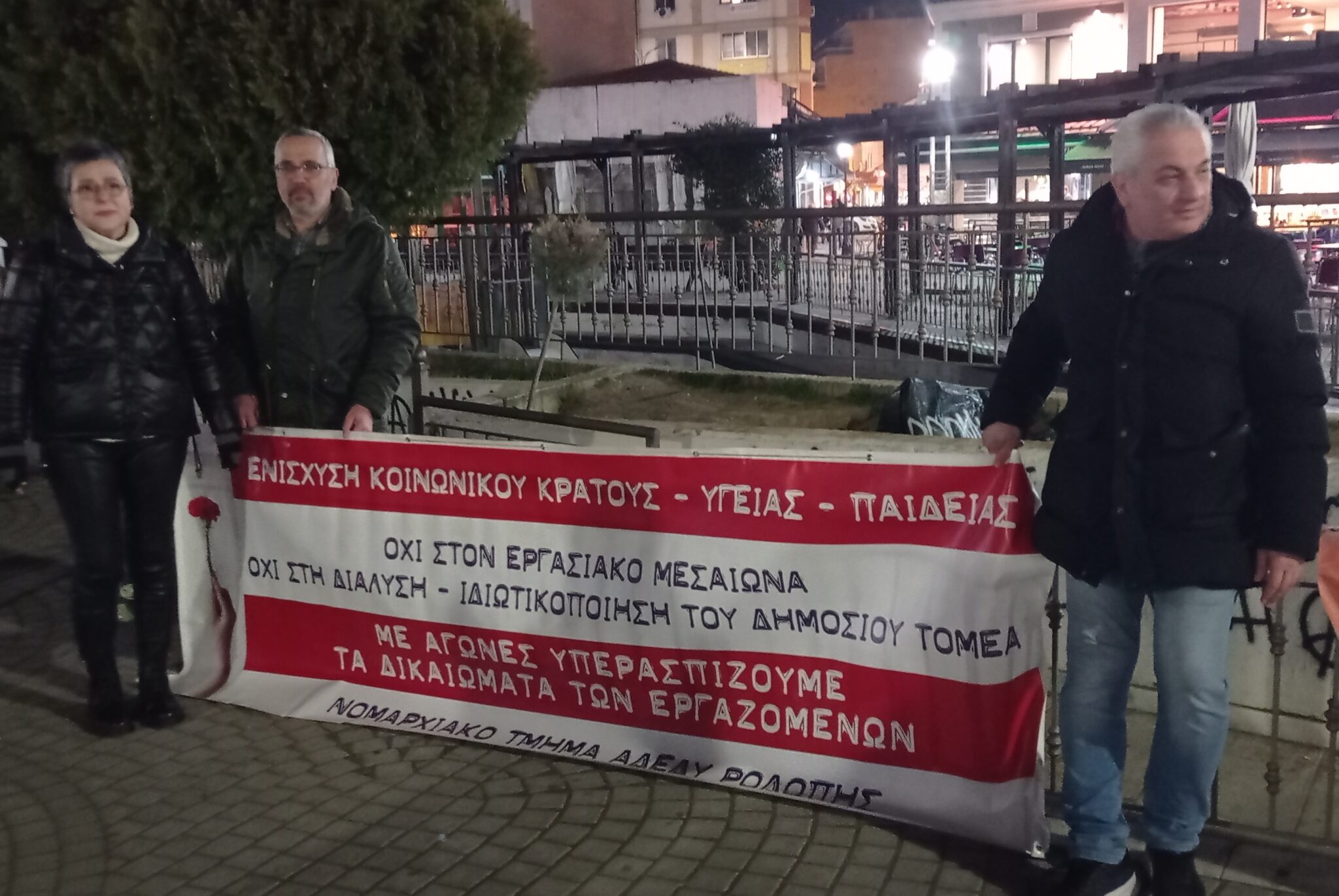 Δημόσιοι υπάλληλοι από διάφορους κλάδους συμμετείχαν στο συλλαλητήριο που πραγματοποιήθηκε στην κεντρική πλατεία Κομοτηνής υπό την οργανωτική αιγίδα του νομαρχιακού τμήματος Ροδόπης της ΑΔΕΔΥ, του οποίου η πρόεδρος, Μεταξία Σουλιώτη, στην ομιλία της, τόνισε, μεταξύ άλλων: “Μετά από δεκαπέντε πέτρινα χρόνια ήρθε η ώρα να διεκδικήσουμε το αυτονόητο: την αξιοπρέπειά μας”.