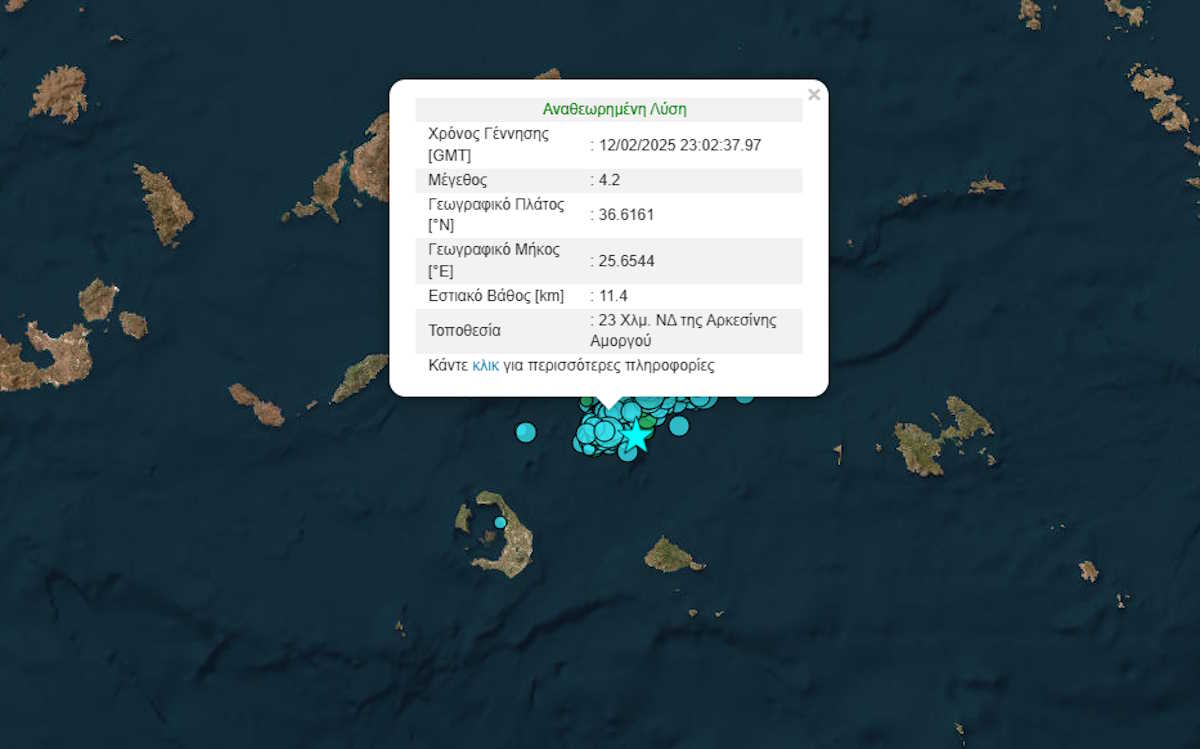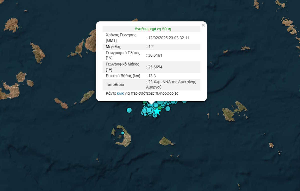 Το επίκεντρο της νέας δόνησης είναι πάλι στα 23 χιλιόμετρα, αλλά αυτή τη φορά νότια – νοτιοδυτικά της Αρκεσίνης.