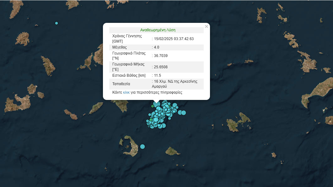 Οπως αναφέρει η ανακοίνωση, στις 05:37 σήμερα Σάββατο το σεισμολογικό δίκτυο κατέγραψε ασθενή σεισμική δόνηση μεγέθους 4 βαθμών της κλίμακας Ρίχτερ με επίκεντρο τον υποθαλάσσιο χώρο 16 χιλιόμετρα νοτιοδυτικά της Αρκεσίνης Αμοργού.