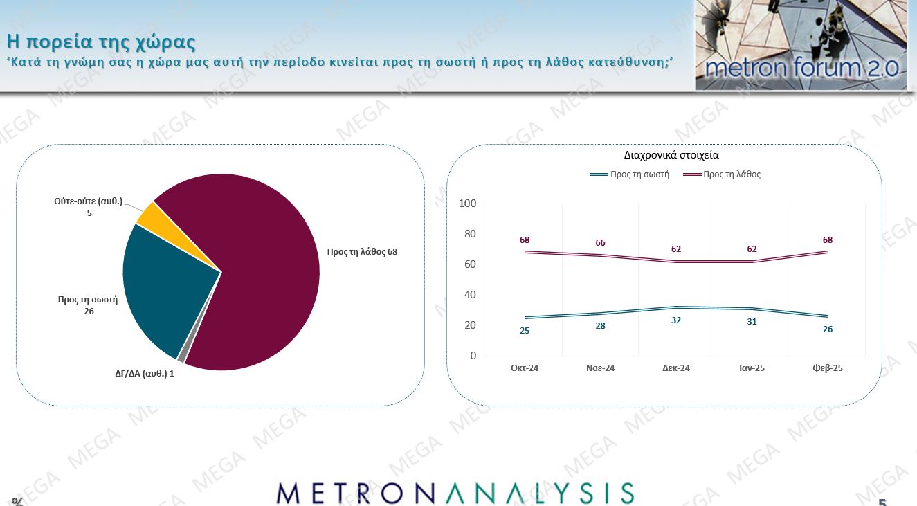 Το κλίμα δυσαρέσκειας καταγράφεται στις απαντήσεις ως προς το εάν η χώρα κινείται προς τη σωστή ή τη λάθος κατεύθυνση, όπου οι απαντήσεις «προς τη λάθος» ανεβαίνουν στο 68%, ενώ οι απαντήσεις «προς τη σωστή» υποχωρούν στο 26%.