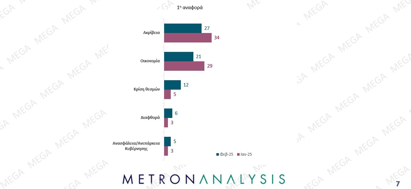 Ιδιαίτερο ενδιαφέρον έχει η μέτρηση που κάνει η δημοσκόπηση των προβλημάτων που αναφέρουν οι πολίτες αυθόρμητα ως σημαντικότερα. Και γιατί πλάι στην ακρίβεια (27%) και την οικονομία (21%), δύο απαντήσεις που σε μεγάλο βαθμό αντανακλούν την κρίση κόστους ζωής, έχουμε την κρίση θεσμών (12%), τη διαφθορά (6%) και την ανασφάλεια / ανεπάρκεια κυβέρνησης (5%).