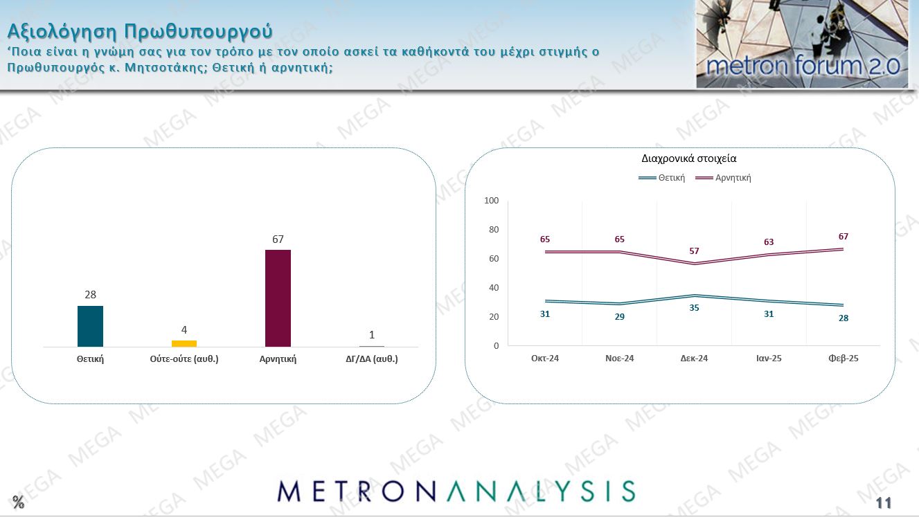 Η δημοσκόπηση αποτυπώνει ένα έντονο κλίμα αποδοκιμασίας της κυβέρνησης και τους ίδιου του Κυριάκου Μητσοτάκη, πράγμα που συνάδει και με το συνολικότερο κλίμα δυσαρέσκειας για την οικονομία αλλά και τους χειρισμούς στα Τέμπη.