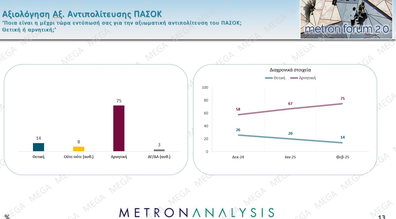 Όμως, την ίδια στιγμή καταγράφεται αποδοκιμασία και της αξιωματικής αντιπολίτευσης και του Νίκου Ανδρουλάκη, πράγμα που σημαίνει ότι αυτή τη στιγμή η αντιπολίτευση δεν κατορθώνει να μεταφράσει τη δυσαρέσκεια σε κοινωνική δυναμική.