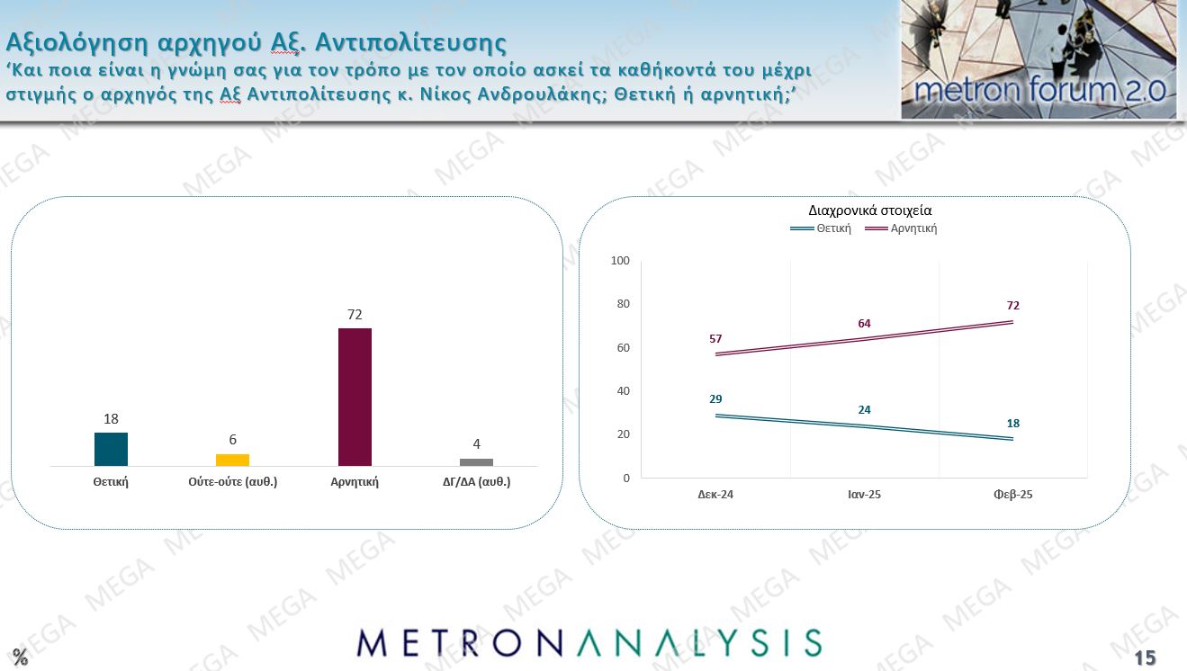 Βαθαίνει η δυσαρέσκεια μέσα στην κοινωνία με τη διάχυτη αίσθηση μιας κρίσης θεσμών να έρχεται να προστεθεί στη δυσαρέσκεια για την κρίση κόστους ζωής και την εντεινόμενη οικονομική ανασφάλεια των νοικοκυριών. Αυτό δείχνει η δημοσκόπηση της Metron Analysis που παρουσιάστηκε στο βραδινό δελτίο του MEGA την Πέμπτη 20 Φεβρουαρίου 2025.