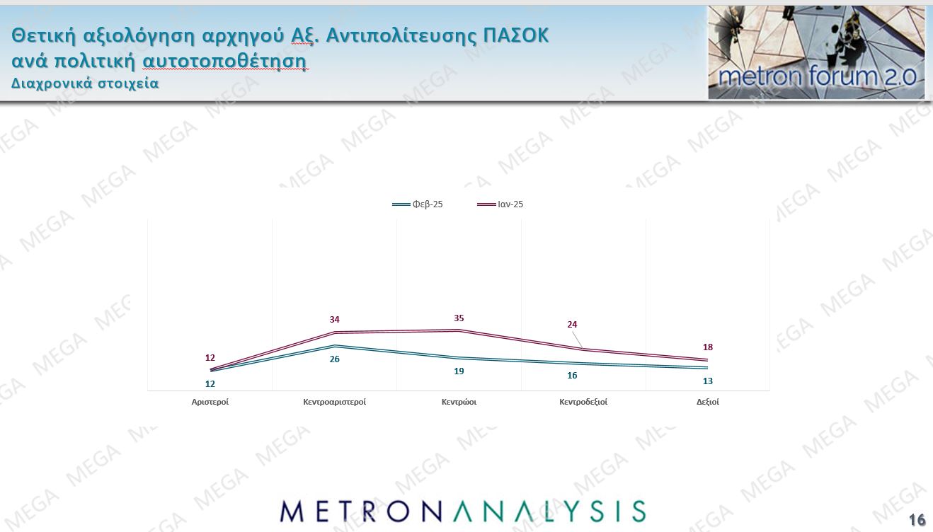 Με την εξαίρεση όσων αυτοπροσδιορίζονται ως κεντρώοι και κεντροδεξιοί, σε όλους τους άλλους αυτοπροσδιρισμούς έχουμε υποχώρηση των θετικών γνωμών, με πιο χαρακτηριστικό παράδειγμα ότι οι θετικές γνώμες σε όσους αυτοπροσδιορίζονται ως δεξιοί υποχωρούν από το 47% στο 37%.
