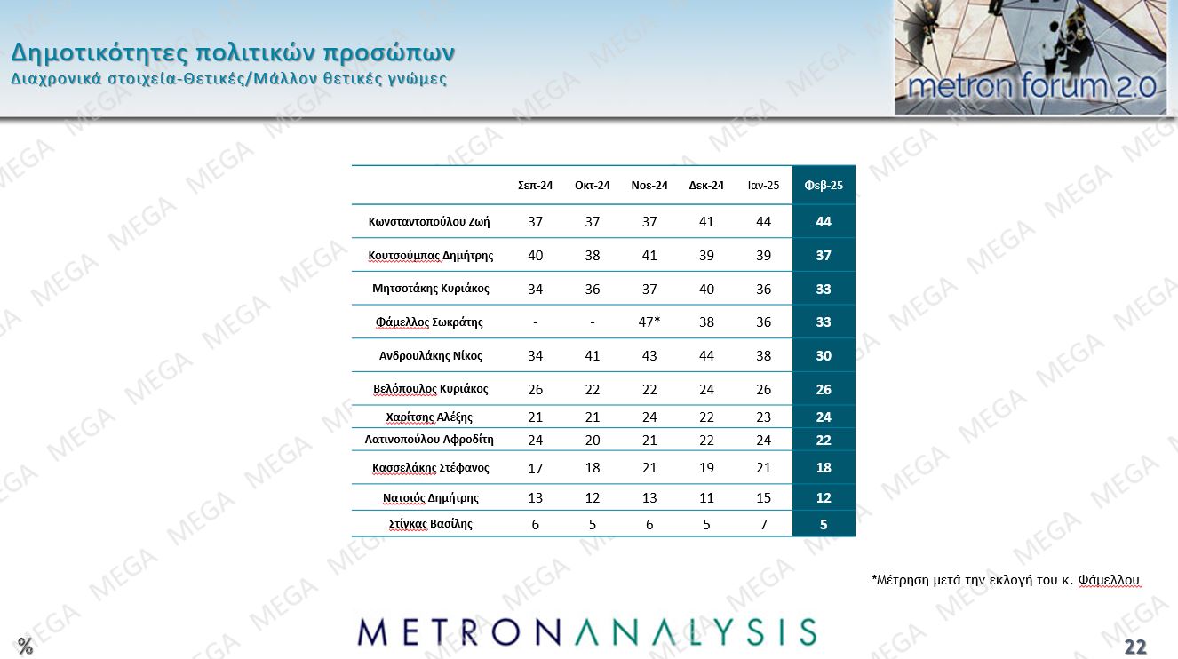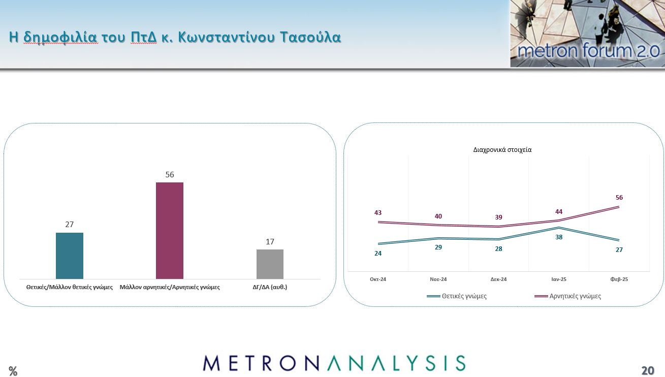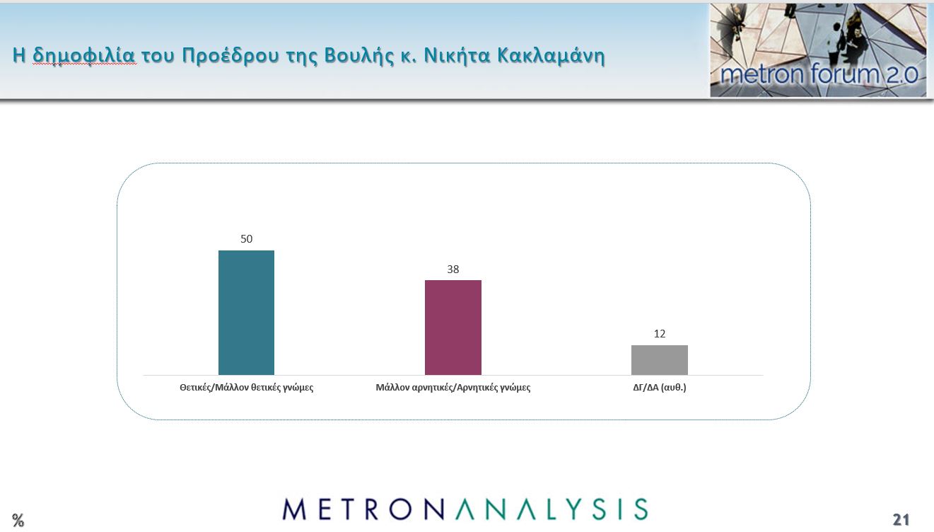 Η αναγγελία της υποψηφιότητας και η εκλογή του Κωνσταντίνου Τασούλα ως Προέδρου της Δημοκρατίας μάλλον δεν ευνόησαν τη δημοφιλία του, καθώς οι αρνητικές γνώμες αυξήθηκαν στο 56% και οι θετικές γνώμες υποχώρησαν στο 27%. Αντιθέτως, φαίνεται ότι ο νέος Πρόεδρος της Βουλής, Νικήτας Κακλαμάνης έχει μια αρκετά θετική αποδοχή, καθώς έχει 50% θετικές γνώμες και 38% αρνητικές.
