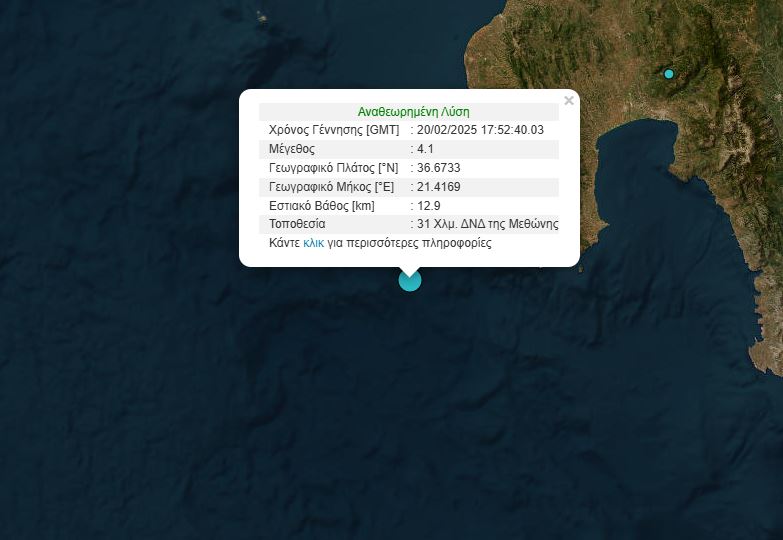 Σεισμική δόνηση 4,1 βαθμών της κλίμακας Ρίχτερ σημειώθηκε στις 19.52 της Πέμπτης 20 Φεβρουαρίου, ανοιχτά της Μεθώνης