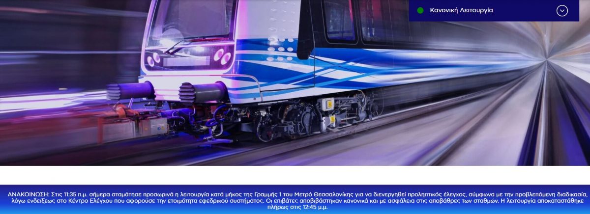 «Στις 11:35 π.μ. σήμερα σταμάτησε προσωρινά η λειτουργία κατά μήκος της Γραμμής 1 του Μετρό Θεσσαλονίκης για να διενεργηθεί προληπτικός έλεγχος, σύμφωνα με την προβλεπόμενη διαδικασία, λόγω ενδείξεως στο Κέντρο Ελέγχου που αφορούσε την ετοιμότητα εφεδρικού συστήματος. Οι επιβάτες αποβιβάστηκαν κανονικά και με ασφάλεια στις αποβάθρες των σταθμών. Η λειτουργία αποκαταστάθηκε πλήρως στις 12:45 μ.μ.», αναφέρει χαρακτηριστικά.