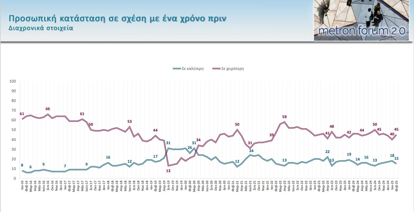 Κοιτάζοντας κανείς τα στοιχεία της έρευνας, έχει ενδιαφέρον πως αντιλήφθηκαν οι πολίτες τις αλλαγές στην οικονομική τους κατάσταση από την περίοδο των Μνημονίων έως και την ανάληψη της εξουσίας από τη Νέα Δημοκρατία, έως σήμερα.