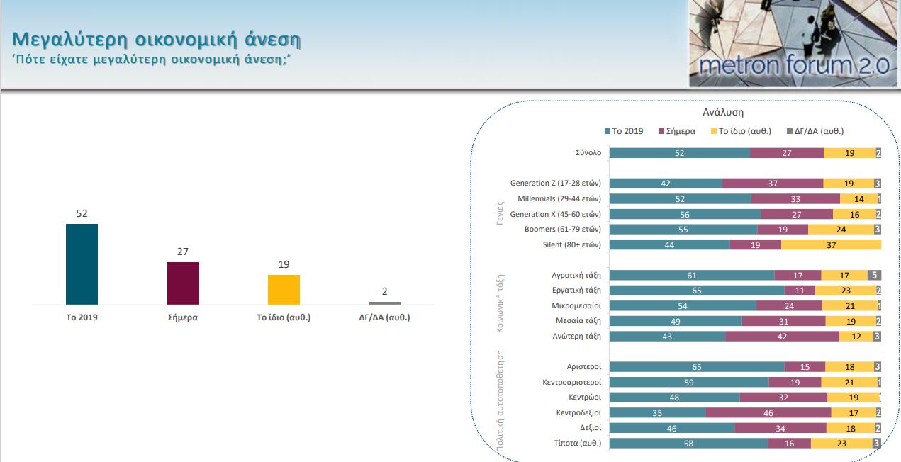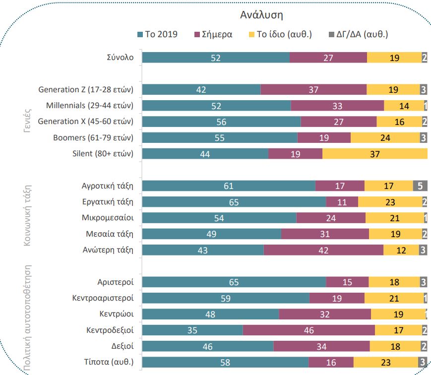 Έκπληξη δε αποτελεί το γεγονός πως την άποψη ότι το 2019 βρίσκονταν σε καλύτερη οικονομική κατάσταση έχει και το 46% όσων προσδιορίζονται δεξιοί και μόλις το 34% υποστηρίζει ότι σήμερα έχουν μεγαλύτερη οικονομική άνεση.