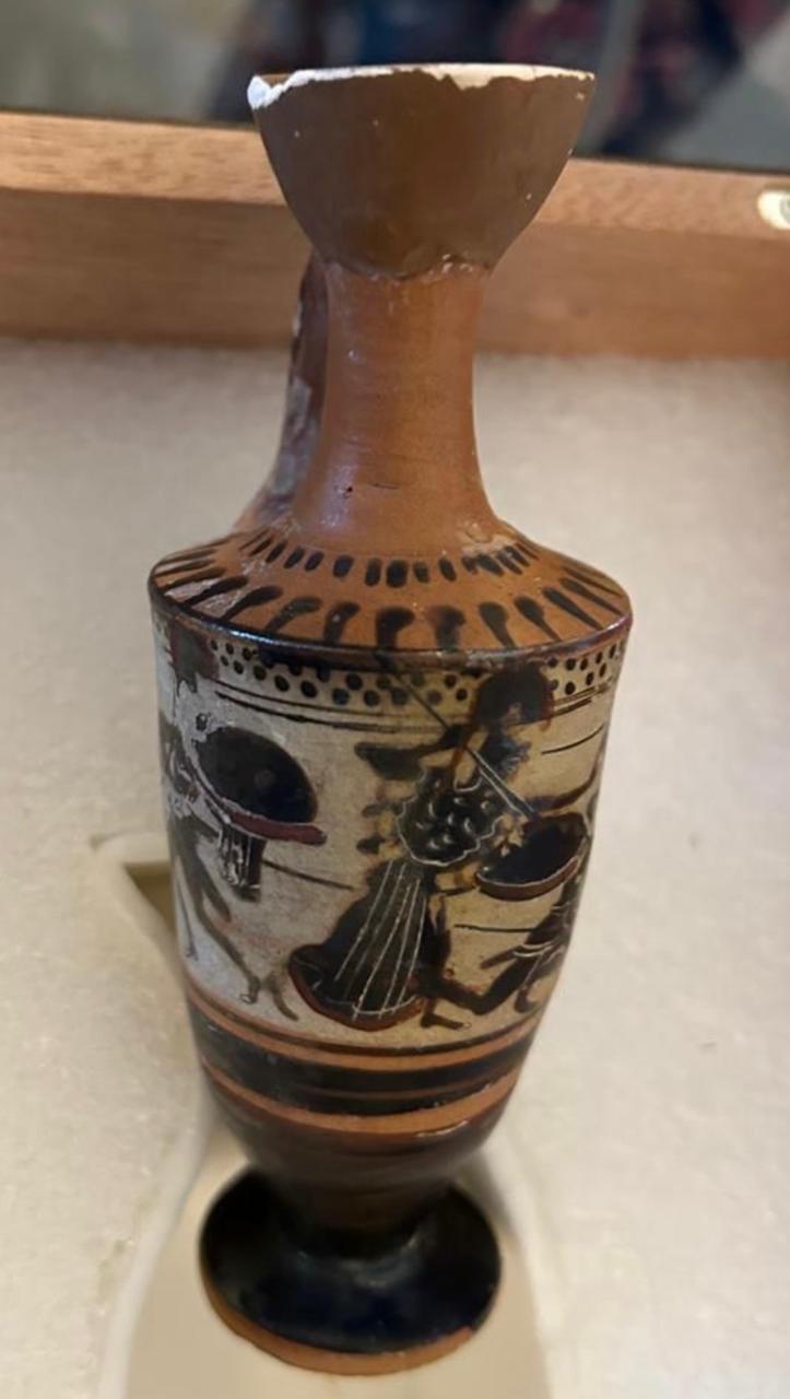 Το ληκύθιο, ύψους 12 εκ., το οποίο παρέδωσε η επιμελήτρια του Μουσείου Glencairn Wendy Closterman φέρει, επί λευκού βάθους, μελανόμορφη παράσταση μάχης Αθηνάς εναντίον Γίγαντα με δύο οπλίτες εκατέρωθεν του πολεμικού επεισοδίου.