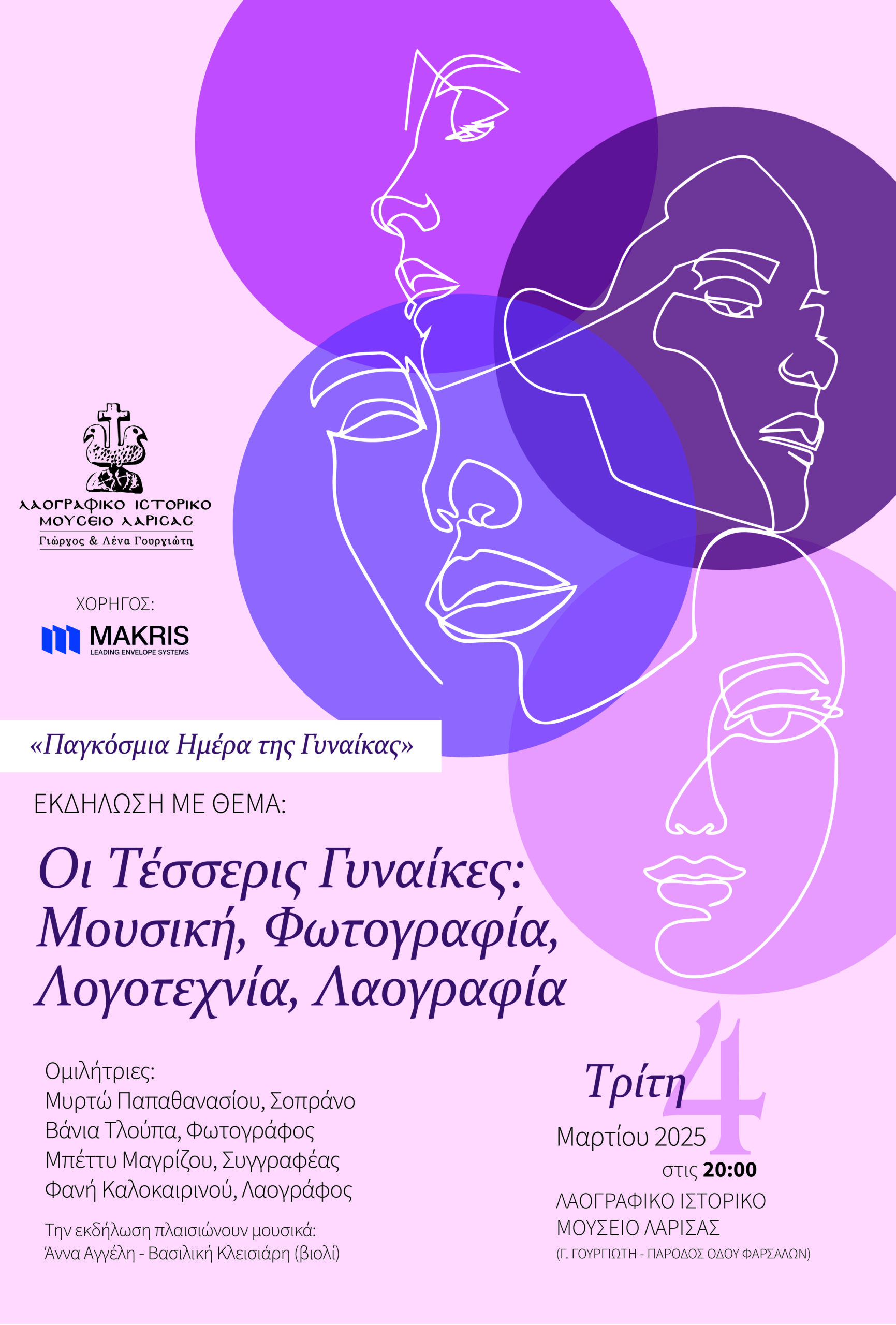 Το Λαογραφικό Ιστορικό Μουσείο Λάρισας – Γιώργος και Λένα Γουργιώτη τιμώντας την «Παγκόσμια Ημέρα της Γυναίκας» διοργανώνει εκδήλωση με θέμα «Οι Τέσσερις Γυναίκες: Μουσική, Φωτογραφία, Λογοτεχνία, Λαογραφία»  την Τρίτη 4 Μαρτίου 2025  στις 20:00 στο χώρο του Μουσείου (Γ. Γουργιώτη – πάροδος οδού Φαρσάλων):