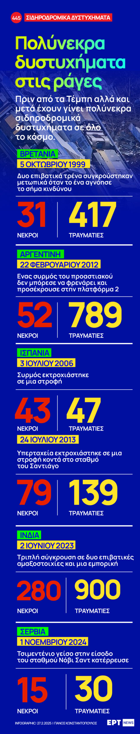 InfographicΡΟΗ ΕΙΔΗΣΕΩΝΣύγκρουση τρένων Τέμπη Infographic – Πολύνεκρα δυστυχήματα στις ράγες By: Thessalonikinow Ημερομηνία: February 27, 2025 Πριν από τα Τέμπη αλλά και μετά, έχουν γίνει πολύνεκρα σιδηροδρομικά δυστυχήματα σε όλο τον κόσμο. www.ertnews.gr Πηγή: ertnews.gr Previous articleΠάτρα: Με ένα τεράστιο πανό στις σκάλες του Αγίου Νικολάου το κάλεσμα των φοιτητών στο συλλαλητήριοNext articleΠώς θα κινηθούν αύριο Μετρό, Ηλεκτρικός και Τραμ – Αναλυτικά τα δρομολόγια – Ποιοι σταθμοί θα είναι κλειστοί Thessalonikinowhttps://thessalonikinow.gr κοινοποιήστε την ανάρτηση FacebookTwitterPinterestWhatsApp ΕγγραφείτεΕγγραφειτε τωραΈχω διαβάσει και αποδέχομαι την Πολιτική Απορρήτου Δημοφιλή Νέο ραντεβού για τις αγαπημένες σειρές της ΕΡΤ1 και το τηλεπαιχνίδι «Στην πίεση» Κ. Τσουκαλάς: Ο πρωθυπουργός, ενώ διακηρύττει ότι η διαφθορά πρέπει να σταματήσει, στην πραγματικότητα εξουσιοδοτεί τη συνέχισή της Αετομηλίτσα Γράμμου: Εορταστικό αντάμωμα και παρέλαση των κατοίκων Μαρινάκης για Άγνωστο Στρατιώτη: Η ΕΛΑΣ έχει σχέδιο και θα εφαρμοστεί τις επόμενες ημέρες – Κάποιοι θέλουν να αναβιώσουν μέρες διχασμού Λάκης Λαζόπουλος: Στην εκπομπή μου θα δείτε καγκουρό στην Πίνδο, Porsche στις στάνες, πρόβατα που καλούνται σαν μάρτυρες Περισσότερα σαν αυτόRelated Νέο ραντεβού για τις αγαπημένες σειρές της ΕΡΤ1 και το τηλεπαιχνίδι «Στην πίεση» Thessalonikinow - October 27, 2025 Από την Τετάρτη 29 Οκτωβρίου, οι αγαπημένες σειρές της ΕΡΤ –«Ηλέκτρα», «Καλά... Κ. Τσουκαλάς: Ο πρωθυπουργός, ενώ διακηρύττει ότι η διαφθορά πρέπει να σταματήσει, στην πραγματικότητα εξουσιοδοτεί τη συνέχισή της Thessalonikinow - October 27, 2025 «Οι κινήσεις της κυβέρνησης και όλα όσα συμβαίνουν δείχνουν... Αετομηλίτσα Γράμμου: Εορταστικό αντάμωμα και παρέλαση των κατοίκων Thessalonikinow - October 27, 2025 Στην ορεινή Αετομηλίτσα Γράμμου, οι κάτοικοι παρήλασαν για... Μαρινάκης για Άγνωστο Στρατιώτη: Η ΕΛΑΣ έχει σχέδιο και θα εφαρμοστεί τις επόμενες ημέρες – Κάποιοι θέλουν να αναβιώσουν μέρες διχασμού Thessalonikinow - October 27, 2025 «Η ΕΛΑΣ έχει επιχειρησιακό σχέδιο για τον Άγνωστο Στρατιώτη»,...