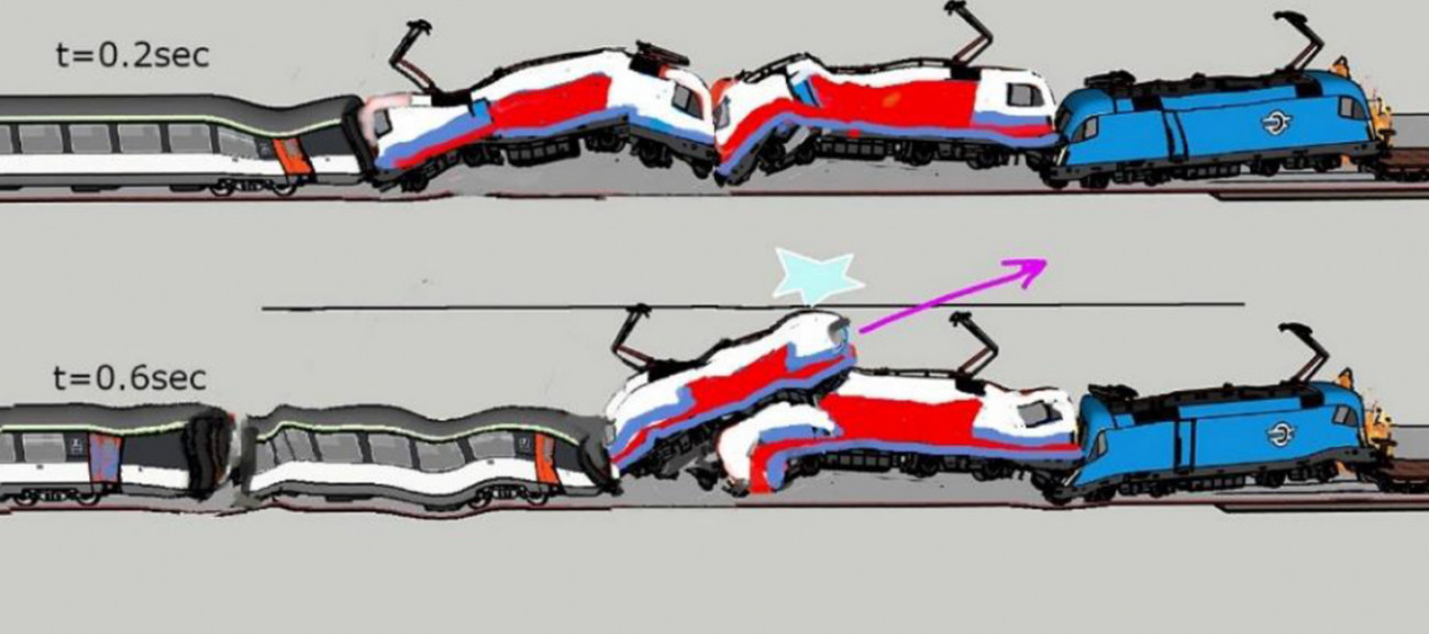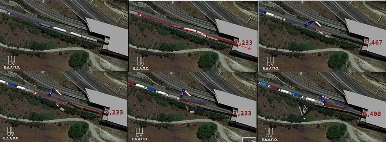 Συνολική προσημειωμένη εικόνα του μηχανισμού δυστυχήματος με τους αντίστοιχους χρόνου. Η εικόνα 2 δείχνει την πρώτη πρόσκρουση. Η εικόνα 4 δείχνει την δεύτερη πρόσκρουση και οι εικόνες 5 και 6 δείχνουν την κίνηση μέχρι την ακινητοποίηση.