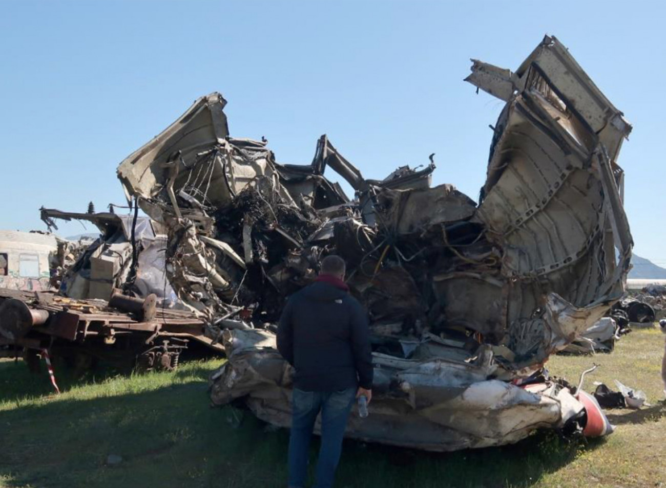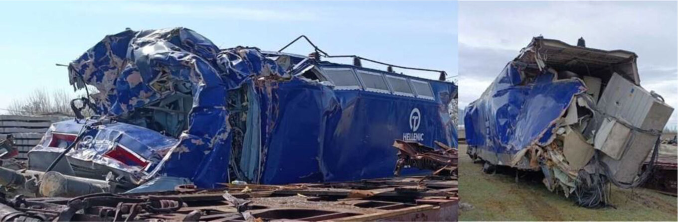 Η πρώτη μηχανή της εμπορικής αμαξοστοιχίας (120-022) παρουσιάζει εκτεταμένες ζημιές από την πολύ βαριά μετωπική σύγκρουση με την μηχανή (120-023) της επιβατικής αμαξοστοιχίας.