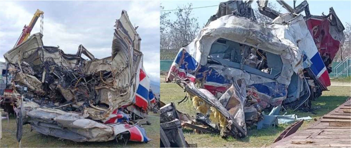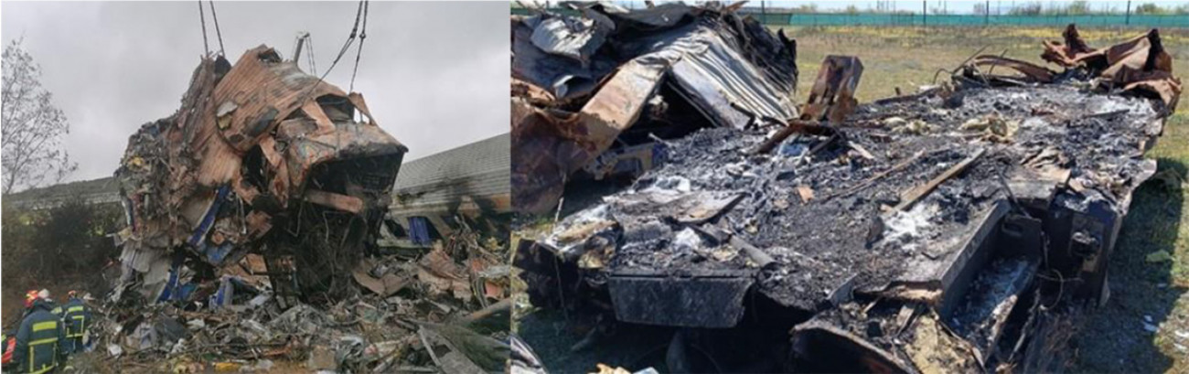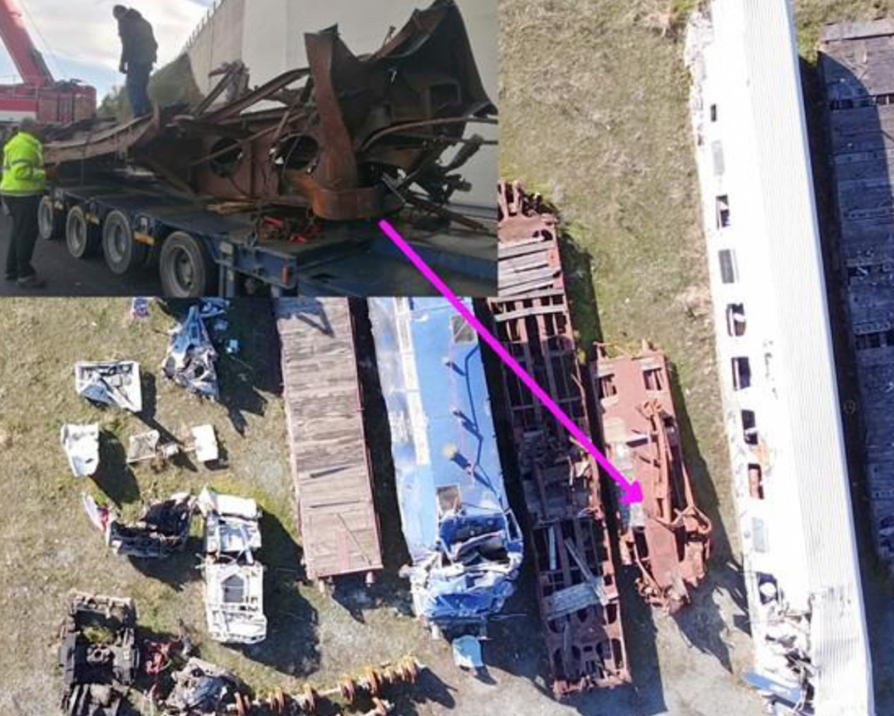 Υπολείμματα του βαγονιού με το εστιατόριο (αριστερά) σε σχήμα S όπως βρέθηκε επί τόπου, και δεξιά η πλατφόρμα του ίδιου βαγονιού στη θέση Κουλούρι