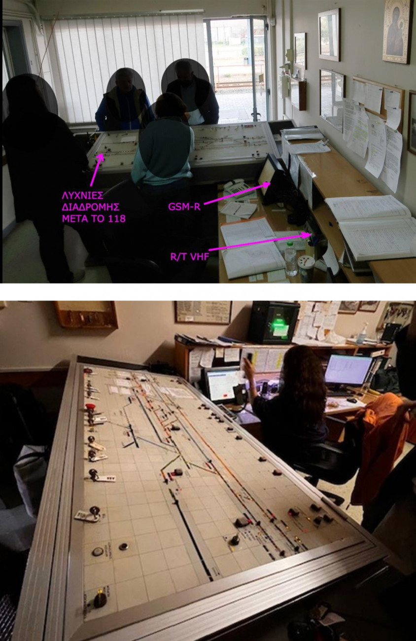 Οι θέσεις των σταθμαρχών όταν βλέπουν προς τον πίνακα ελέγχου (επάνω) και όταν επικοινωνούν (κάτω) με τον σταθμό Λάρισας