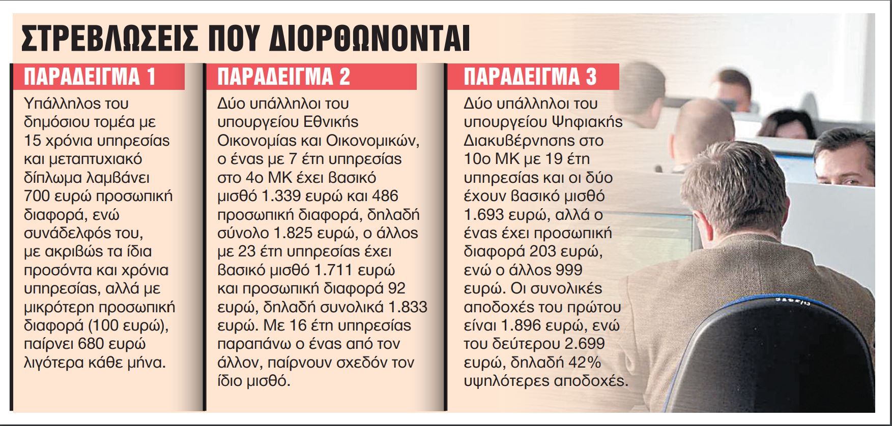 Για παράδειγμα, υπάλληλος του δημόσιου τομέα με 15 χρόνια υπηρεσίας και μεταπτυχιακό δίπλωμα λαμβάνει 700 ευρώ προσωπική διαφορά, ενώ συνάδελφός του, με ακριβώς τα ίδια προσόντα και χρόνια υπηρεσίας, αλλά με μικρότερη προσωπική διαφορά (100 ευρώ), παίρνει 680 ευρώ λιγότερα κάθε μήνα.