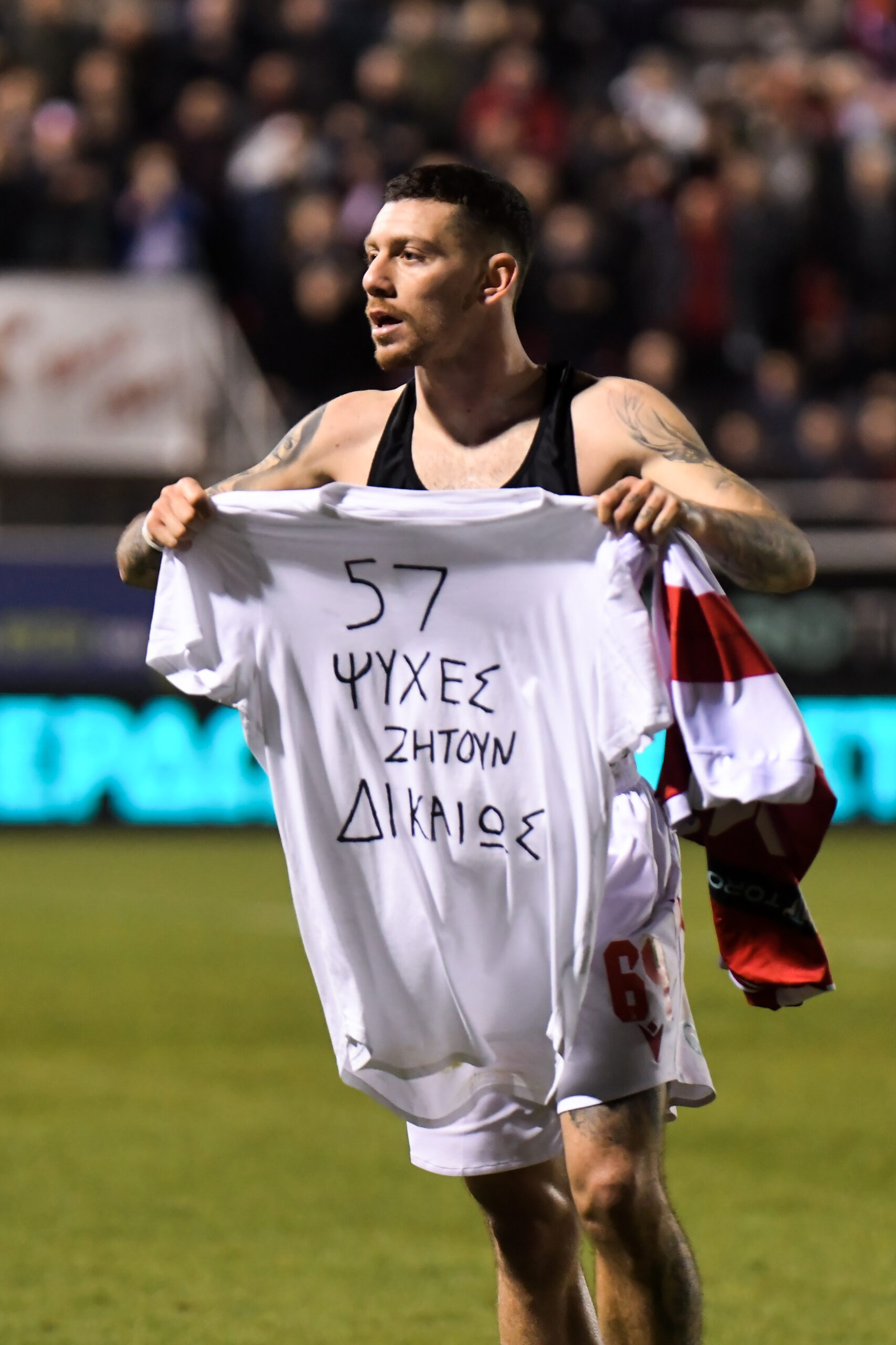 Ο Δεληγιαννίδης ύψωσε μία φανέλα με τη φράση: «57 ψυχές ζητούν δικαίωση» σε μια πολύ όμορφη και ανθρώπινη κίνηση.