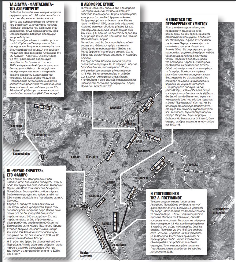 Πιο προχωρημένη από όλες είναι η υπογειοποίηση της Λεωφόρου Ποσειδώνος, η οποία υλοποιείται στο πλαίσιο του project του Ελληνικού και εκτιμάται ότι θα λειτουργήσει το 2026. Παράλληλα, εξετάζεται η μεγάλη αστική σήραγγα της Ηλιούπολης, η απεμπλοκή της επέκτασης της Λεωφόρου Κύμης, που στο μεγαλύτερο μέρος της θα είναι υπόγεια, και η λειτουργία των «δίδυμων» σηράγγων-φάντασμα του Ασπροπύργου, στο πλαίσιο υλοποίησης του τριπλού Κόμβου του Σκαραμαγκά. Ξεχωριστό ρόλο στο παραλιακό μέτωπο θα έχουν μέσα στα επόμενα τρία χρόνια και οι «ψευδο-σήραγγες» του Φαλήρου.