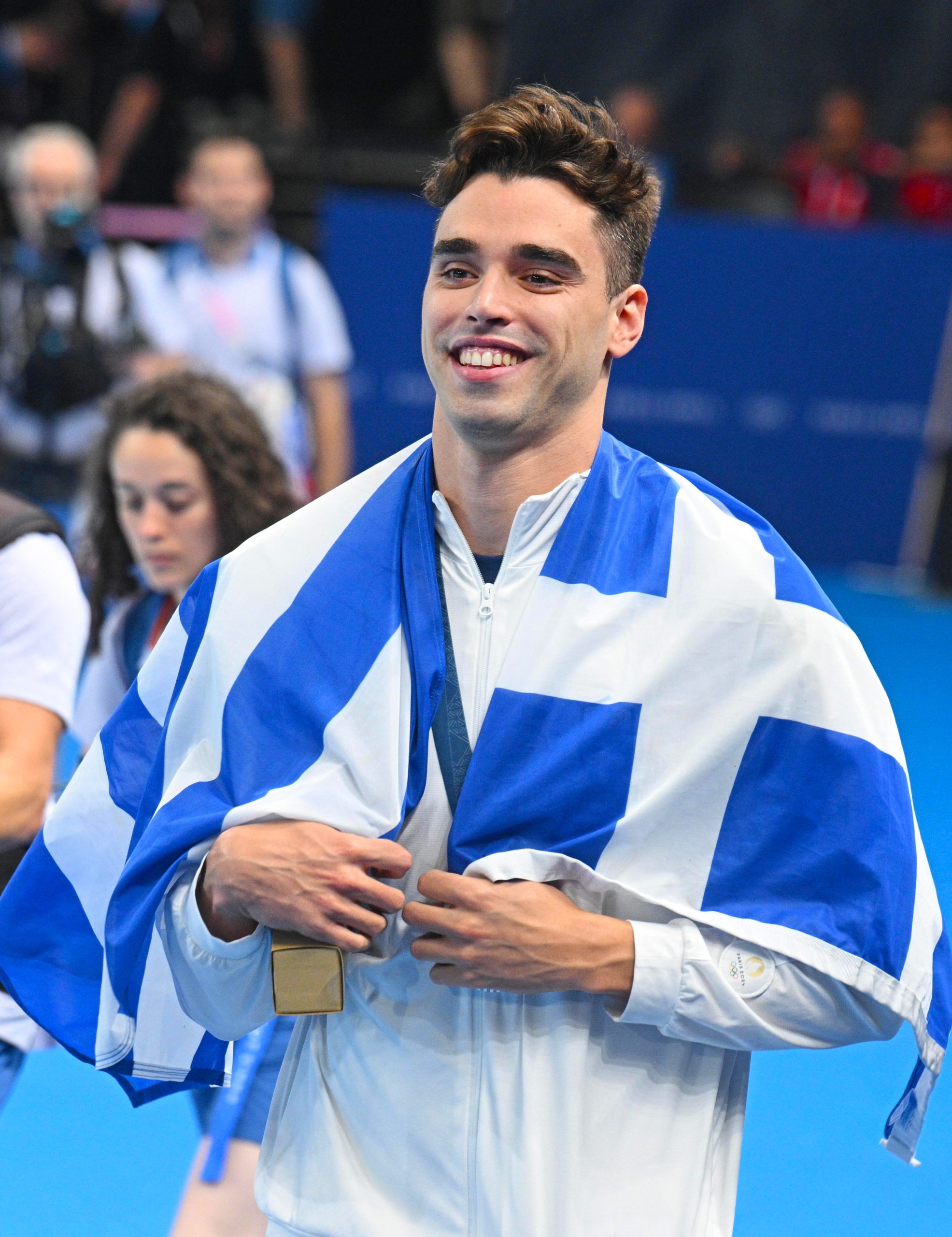 Smiles and pride: Apostolos Christou celebrating his silver in the 200-meter backstroke in Paris. A historic moment dedicated to Olympiacos’ Centenary