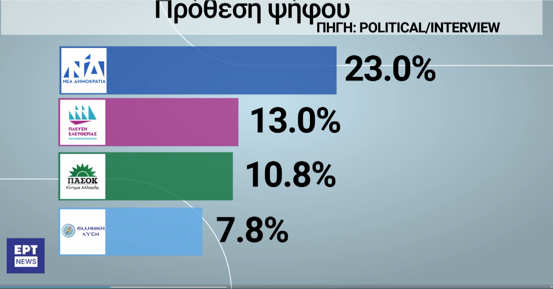Η νέα δημοσκόπηση της Interview για την εφημερίδα Political δείχνει ανοδική τάση της ΝΔ και την Πλεύση Ελευθερίας να παραμένει δεύτερο κόμμα. Στο ερώτημα «αν είχαμε εκλογές την επόμενη Κυριακή, εσείς ποιο κόμμα θα ψηφίζατε», η ΝΔ διατηρεί το διψήφιο προβάδισμα έναντι της Πλεύσης Ελευθερίας με τα ποσοστά να καταγράφονται ως εξής: