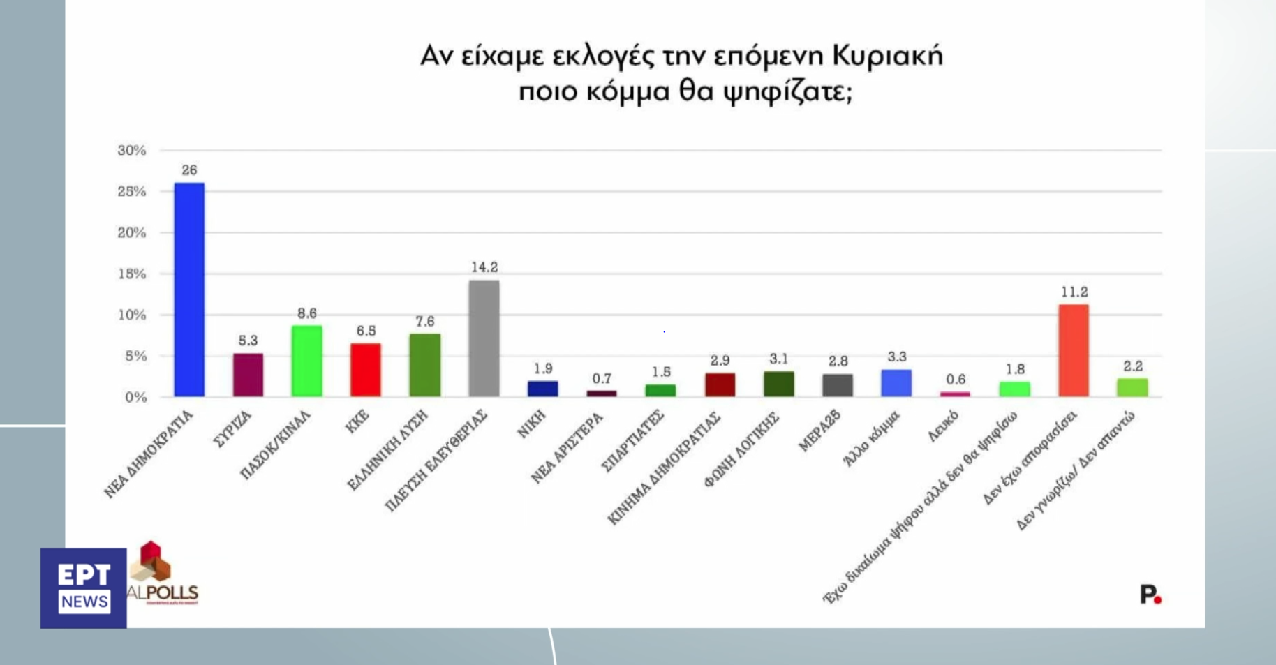 Σύμφωνα με τη δημοσκόπηση ανοδική πορεία σημειώνει η ΝΔ στην εκτίμηση εκλογικού αποτελέσματος με 27% και με διαφορά 12,5 μονάδες από την Πλεύση Ελευθερίας που είναι στο 14,6%.