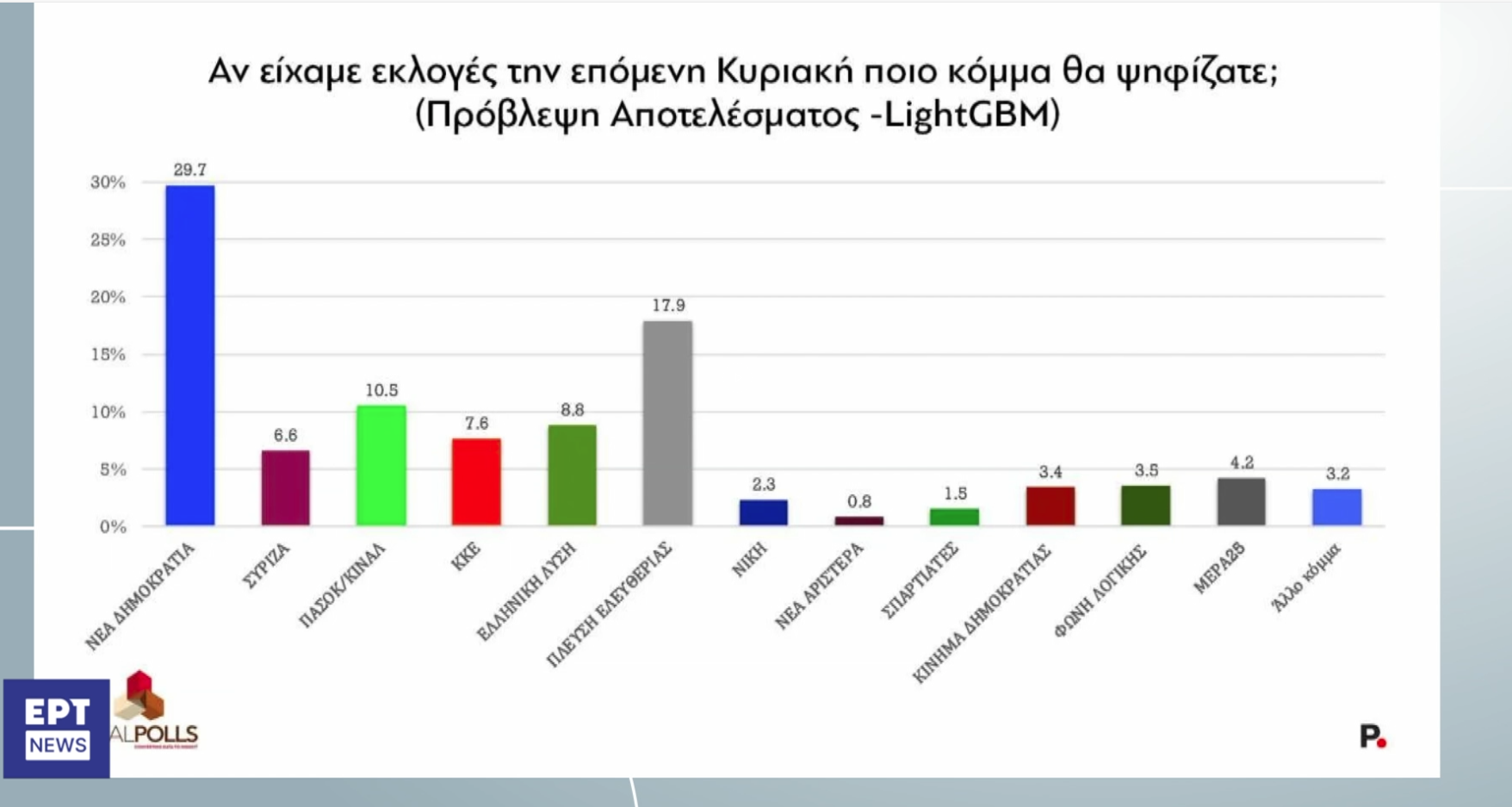 Στη πρόθεση ψήφου και στο ερώτημα αν είχαμε εκλογές την επόμενη Κυριακή ποιο κόμμα θα ψηφίζατε οι συμμετέχοντες στη δημοσκόπηση απάντησαν ως εξής:
