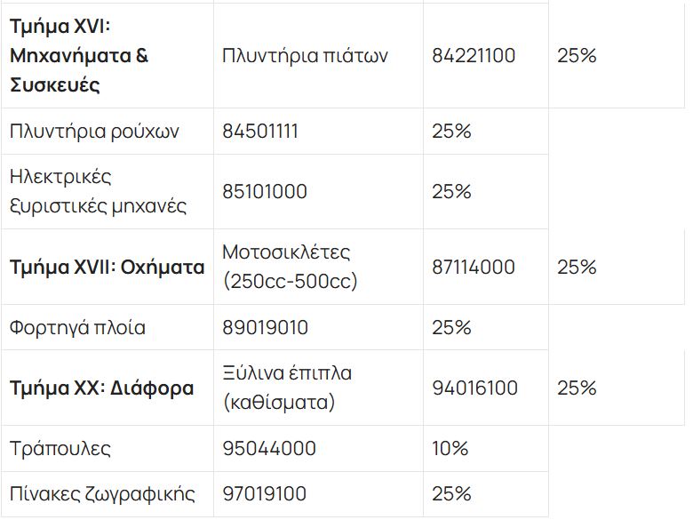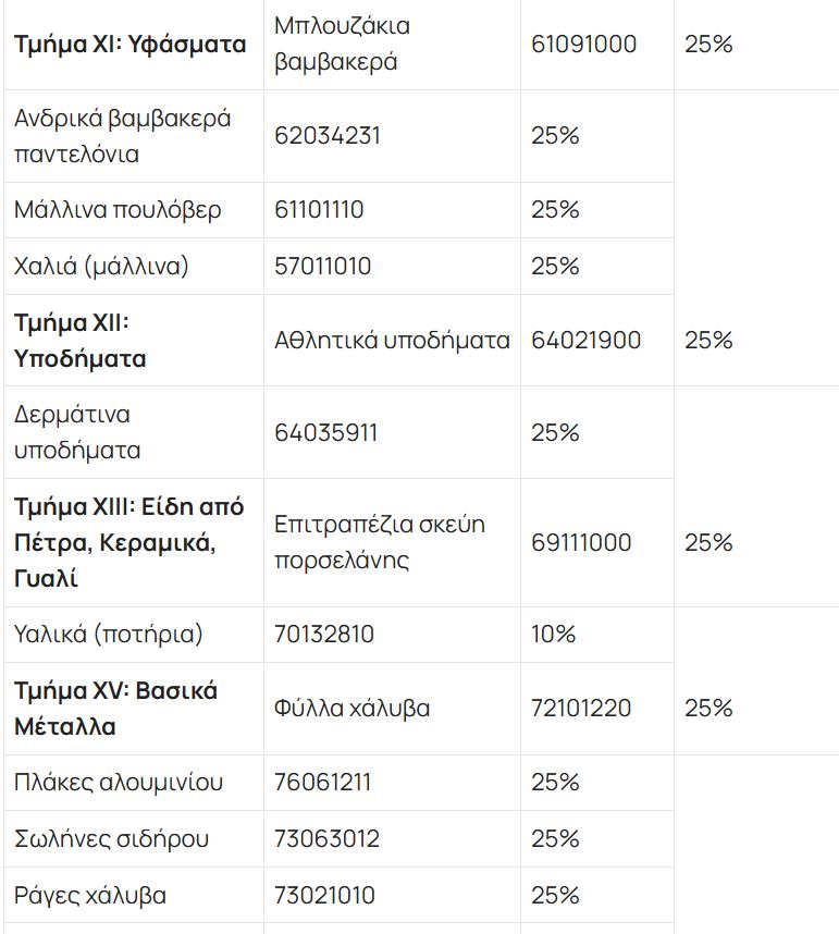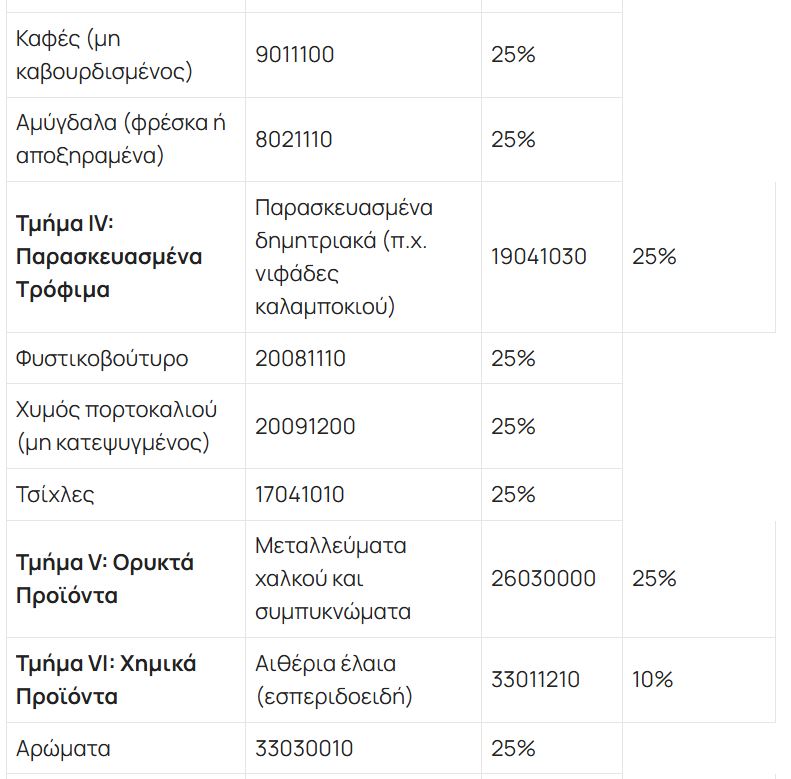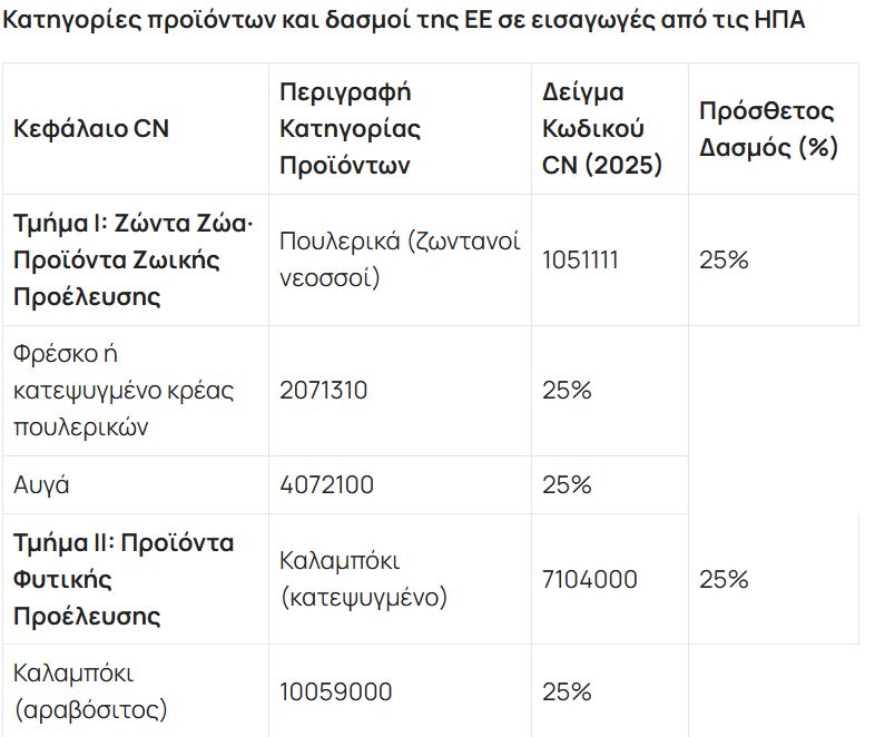 Σύμφωνα με την ΕΡΤ, ένα ευρύ φάσμα προϊόντων (τρόφιμα, υφάσματα, μέταλλα κ.λπ.) υπόκειται σε μεικτό δασμό 10% και 25%. Τα προϊόντα χάλυβα υπόκεινται σε δασμό 25%. Ένας εκτενής κατάλογος καταναλωτικών αγαθών (τρόφιμα, ρούχα, έπιπλα) υπόκειται σε δασμό 25%. Τα αμύγδαλα και η σόγια υπόκεινται σε δασμό 25%. Οι δασμοί αυτοί θα τεθούν σε ισχύ στις 15 Απριλίου 2025, μετά την ολοκλήρωση των εσωτερικών διαδικασιών της ΕΕ, ενώ η πλήρης λίστα θα δημοσιευθεί στην Επίσημη Εφημερίδα της Ευρωπαϊκής Ένωσης.