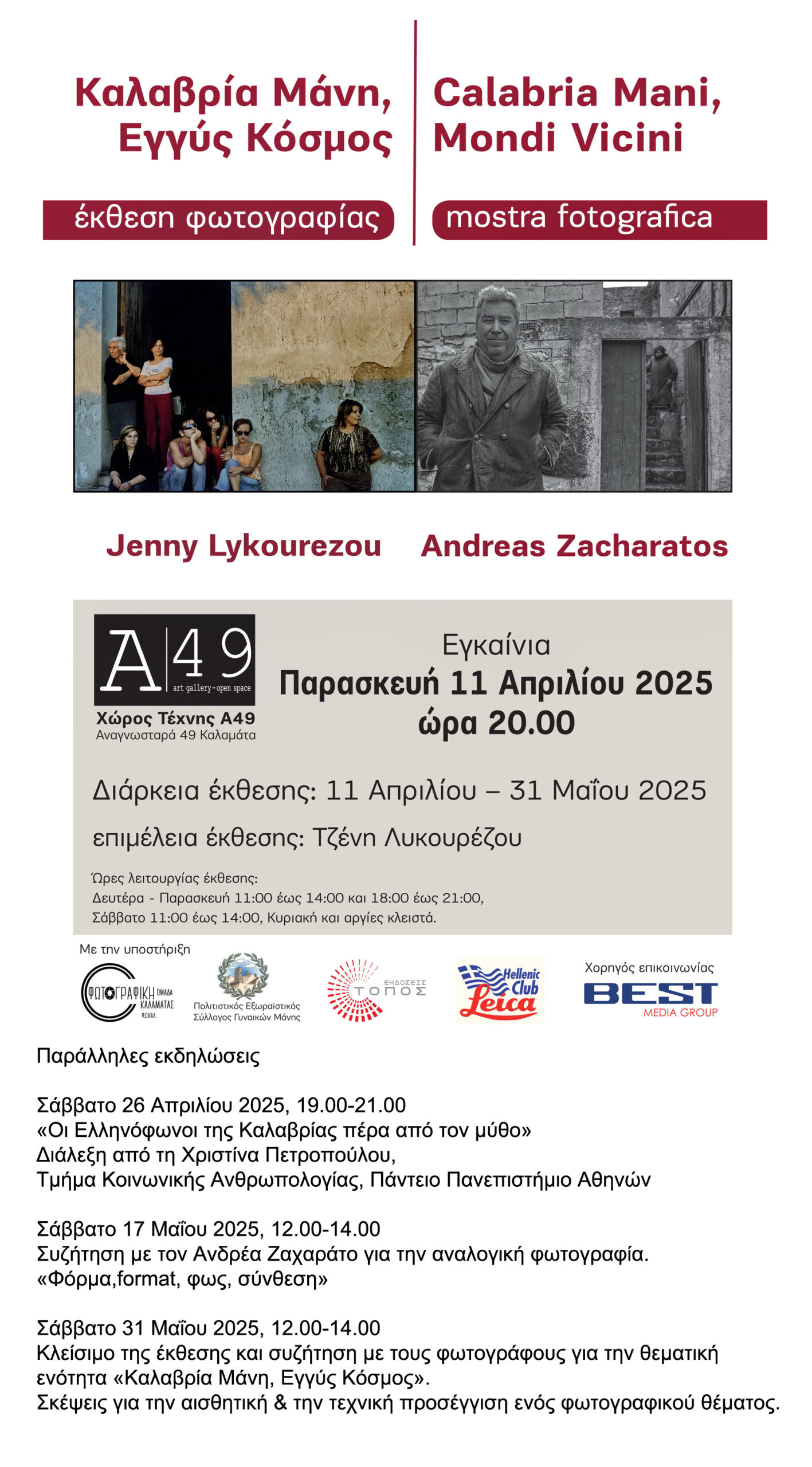Ο χώρος τέχνης Α49 παρουσιάζει τη φωτογραφική έκθεση της Τζένης Λυκουρέζου και του Ανδρέα Ζαχαράτου, «Καλαβρία Μάνη, Εγγύς Κόσμος», από την Παρασκευή 11 Απριλίου έως τις 31 Μάιου 2025.