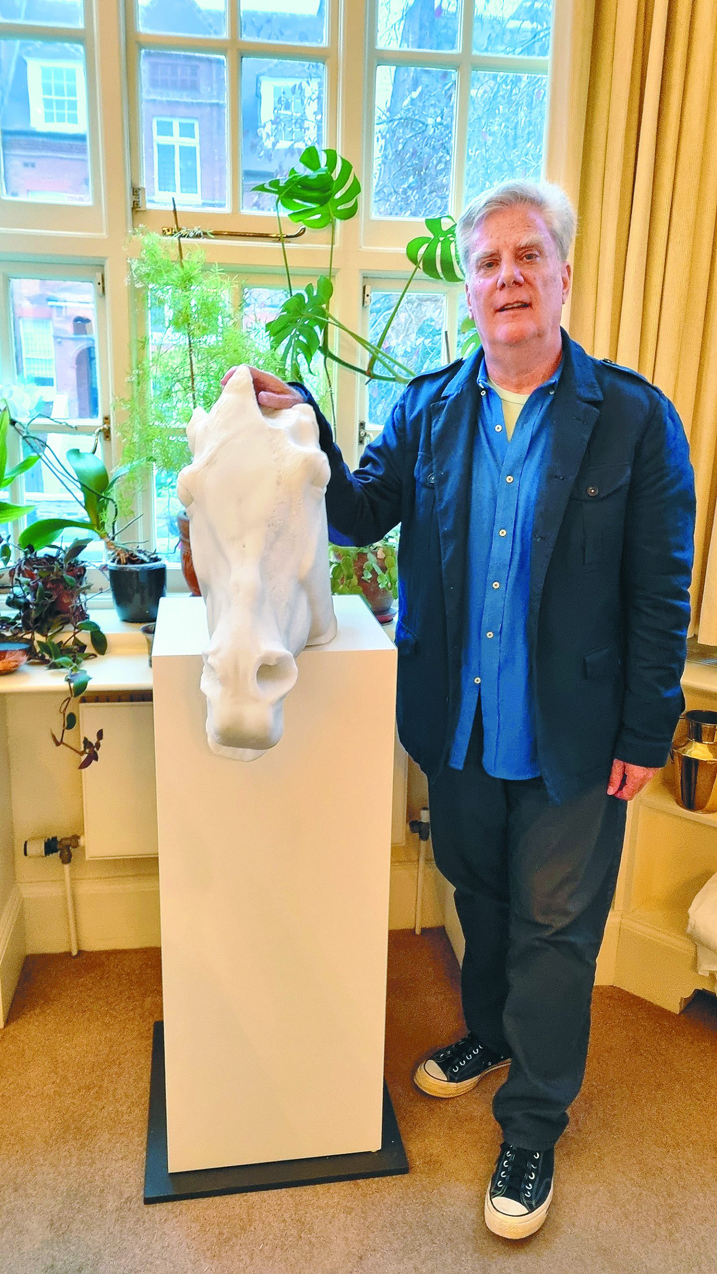Ο διευθυντής του Ινστιτούτου Ψηφιακής Αρχαιολογίας Ρότζερ Μάικλ δίπλα στο πιστό αντίγραφο της κεφαλής αλόγου από το τέθριππο της Σελήνης που κατασκεύασε το 2022