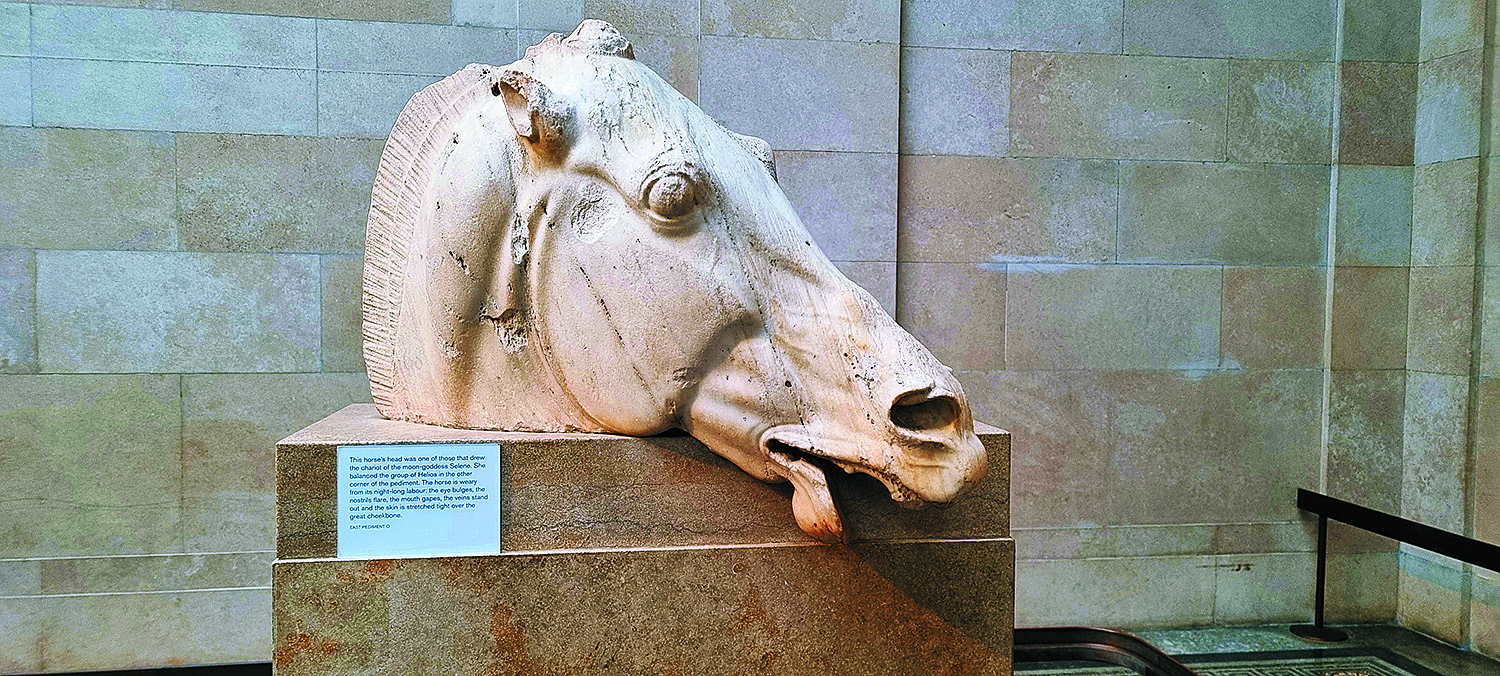 Η κεφαλή αλόγου από το τέθριππο της Σελήνης που κοσμούσε το ανατολικό αέτωμα του Παρθενώνα και σήμερα βρίσκεται στο Βρετανικό Μουσείο.