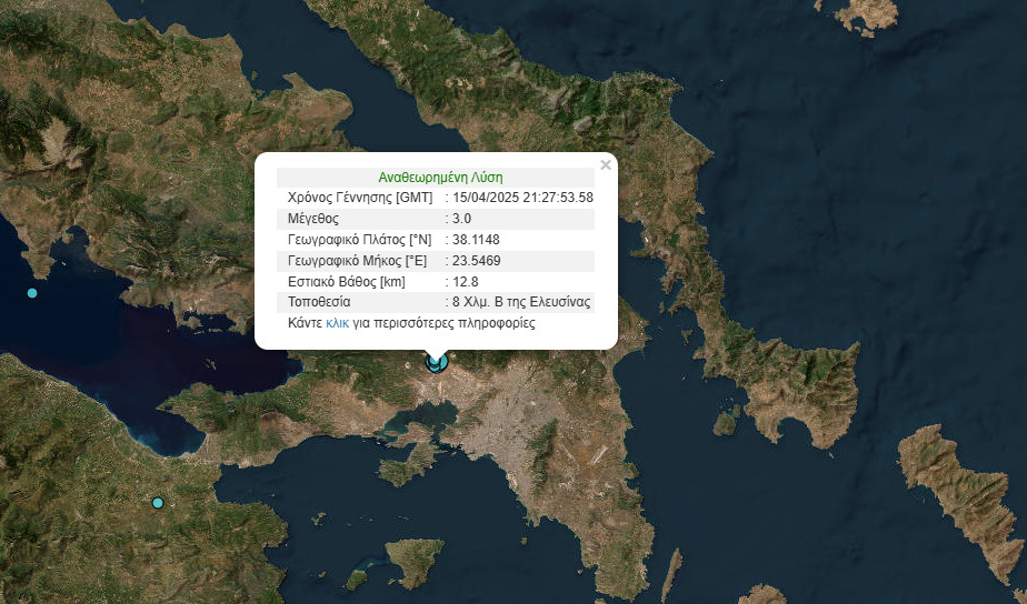 Ο μεγαλύτερος σεισμός μεγέθους 3 Ρίχτερ καταγράφηκε στις 23:27 χθες Τρίτη, σε απόσταση 8 χλμ βόρεια της Ελευσίνας.