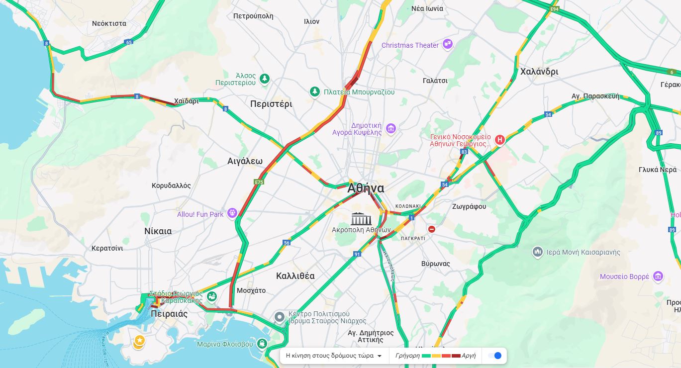 Συγκεκριμένα είναι αυξημένη η κυκλοφορία στον Κηφισό, από το Περιστέρι έως του Ρέντη σε άνοδο και κάθοδο, και στο ρεύμα εξόδου της λεωφόρου Αθηνών από το ύψος του Χαϊδαρίου έχω και τα Νεόκτιστα Ασπροπύργου.