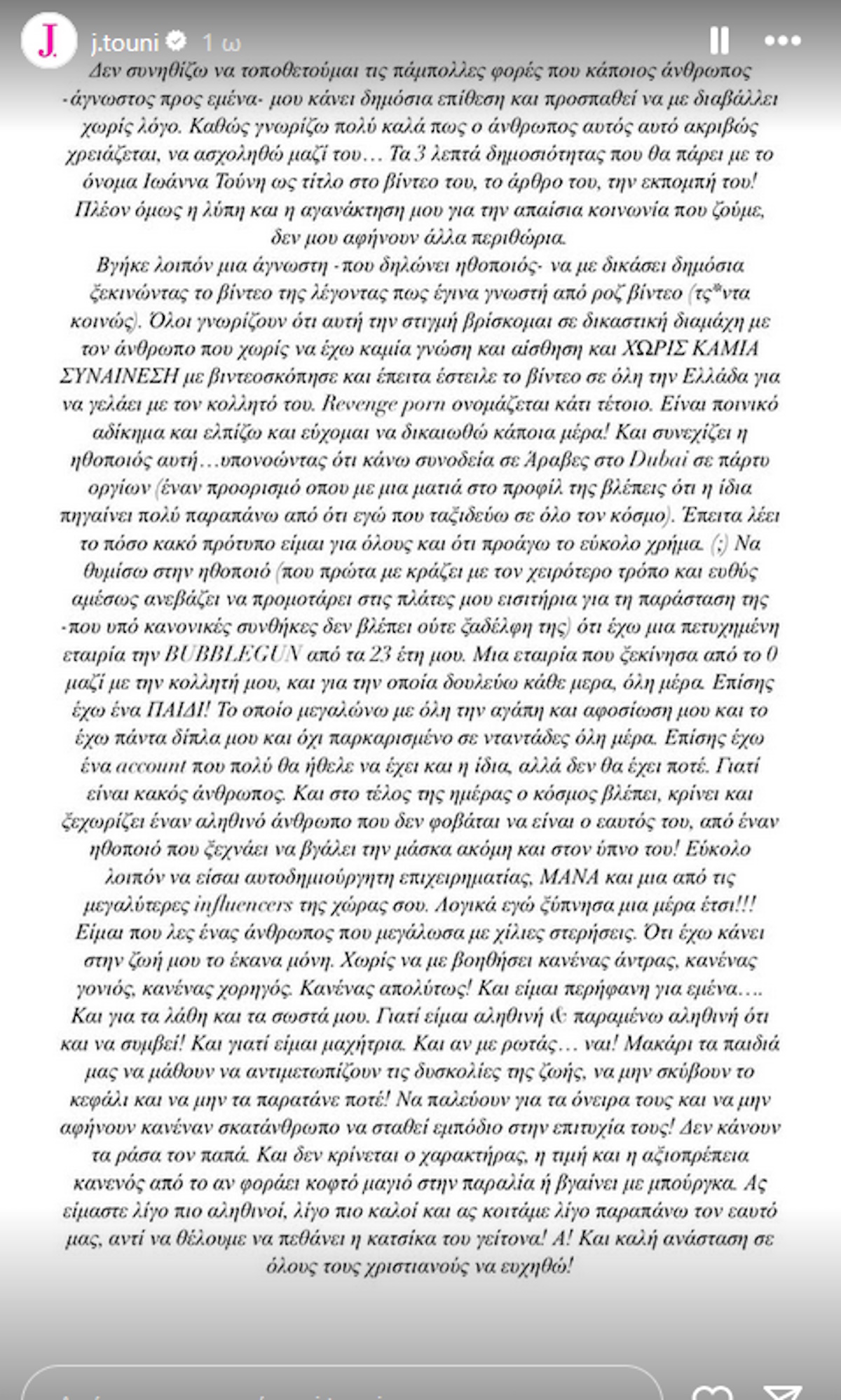 @j.touni Ας πιούμε λίγο τσάι… να πούμε και καμία αλήθεια, γιατί από ψέματα και υποκρισία χορτάσαμε Δεν συνηθίζω να τοποθετούμαι τις πάμπολλες φορές που κάποιος άνθρωπος -άγνωστος προς εμένα- μου κάνει δημόσια επίθεση και προσπαθεί να με διαβάλλει χωρίς λόγο. Καθώς γνωρίζω πολύ καλά πως ο άνθρωπος αυτός αυτό ακριβώς χρειάζεται, να ασχοληθώ μαζί του… Τα 3 λεπτά δημοσιότητας που θα πάρει με το όνομα Ιωάννα Τούνη ως τίτλο στο βίντεο του, το άρθρο του, την εκπομπή του! Πλέον όμως η λύπη και η αγανάκτηση μου για την απαίσια κοινωνία που ζούμε, δεν μου αφήνουν άλλα περιθώρια. Βγήκε λοιπόν μια άγνωστη -που δηλώνει ηθοποιός- να με δικάσει δημόσια ξεκινώντας το βίντεο της λέγοντας πως έγινα γνωστή από ροζ βίντεο (τς*ντα κοινώς). Όλοι γνωρίζουν ότι αυτή την στιγμή βρίσκομαι σε δικαστική διαμάχη με τον άνθρωπο που χωρίς να έχω καμία γνώση και αίσθηση και ΧΩΡΙΣ ΚΑΜΙΑ ΣΥΝΑΙΝΕΣΗ με βιντεοσκόπησε και έπειτα έστειλε το βίντεο σε όλη την Ελλάδα για να γελάει με τον κολλητό του. Revenge porn ονομάζεται κάτι τέτοιο. Είναι ποινικό αδίκημα και ελπίζω και εύχομαι να δικαιωθώ κάποια μέρα! Και συνεχίζει η ηθοποιός αυτή…υπονοώντας ότι κάνω συνοδεία σε Άραβες στο Dubai σε πάρτυ οργίων (έναν προορισμό οπου με μια ματιά στο προφίλ της βλέπεις ότι η ίδια πηγαίνει πολύ παραπάνω από ότι εγώ που ταξιδεύω σε όλο τον κόσμο). Έπειτα λέει το πόσο κακό πρότυπο είμαι για όλους και ότι προάγω το εύκολο χρήμα. (;) Να θυμίσω στην ηθοποιό (που πρώτα με κράζει με τον χειρότερο τρόπο και ευθύς αμέσως ανεβάζει να προμοτάρει στις πλάτες μου εισιτήρια για τη παράσταση της -που υπό κανονικές συνθήκες δεν βλέπει ούτε ξαδέλφη της) ότι έχω μια πετυχημένη εταιρία την BUBBLEGUN από τα 23 έτη μου. Μια εταιρία που ξεκίνησα από το 0 μαζί με την κολλητή μου, και για την οποία δουλεύω κάθε μερα, όλη μέρα. Επίσης έχω ένα ΠΑΙΔΙ! Το οποίο μεγαλώνω με όλη την αγάπη και αφοσίωση μου και το έχω πάντα δίπλα μου και όχι παρκαρισμένο σε νταντάδες όλη μέρα. Επίσης έχω ένα account που πολύ θα ήθελε να έχει και η ίδια, αλλά δεν θα έχει ποτέ. Γιατί είναι κακός άνθρωπος. Και στο τέλος της ημέρας ο κόσμος βλέπει, κρίνει και ξεχωρίζει έναν αληθινό άνθρωπο που δεν φοβάται να είναι ο εαυτός του, από έναν ηθοποιό που ξεχνάει να βγάλει την μάσκα ακόμη και στον ύπνο του! Εύκολο λοιπόν να είσαι αυτοδημιούργητη επιχειρηματίας, ΜΑΝΑ και μια από τις μεγαλύτερες influencers της χώρας σου. Λογικά εγώ ξύπνησα μια μέρα έτσι!!! Είμαι που λες ένας άνθρωπος που μεγάλωσα με χίλιες στερήσεις. Ότι έχω κάνει στην ζωή μου το έκανα μόνη. Χωρίς να με βοηθήσει κανένας άντρας, κανένας γονιός, κανένας χορηγός. Κανένας απολύτως! Και είμαι περήφανη για εμένα…. Και για τα λάθη και τα σωστά μου. Γιατί είμαι αληθινή & παραμένω αληθινή ότι και να συμβεί! Και γιατί είμαι μαχήτρια. Και αν με ρωτάς… ναι! Μακάρι τα παιδιά μας να μάθουν να αντιμετωπίζουν τις δυσκολίες της ζωής, να μην σκύβουν το κεφάλι και να μην τα παρατάνε ποτέ! Να παλεύουν για τα όνειρα τους και να μην αφήνουν κανέναν σκατάνθρωπο να σταθεί εμπόδιο στην επιτυχία τους! Δεν κάνουν τα ράσα τον παπά. Και δεν κρίνεται ο χαρακτήρας, η τιμή και η αξιοπρέπεια κανενός από το αν φοράει κοφτό μαγιό στην παραλία ή βγαίνει με μπούργκα. Ας είμαστε λίγο πιο αληθινοί, λίγο πιο καλοί και ας κοιτάμε λίγο παραπάνω τον εαυτό μας, αντί να θέλουμε να πεθάνει η κατσίκα του γείτονα! Α! Και καλή ανάσταση σε όλους τους χριστιανούς να ευχηθώ! #fyp #foryou #jtouni #byeh