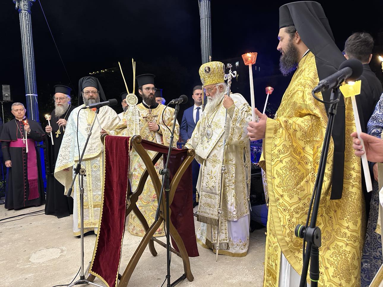 Παράλληλα οι τρεις φιλαρμονικές της πόλης παιάνιζαν το χαρμόσυνο εμβατήριο «Μην φοβάστε Γραικοί». Ο κόσμος με ανάμενες λαμπάδες αντάλλασσε ευχές και δήλωσε εντυπωσιασμένος από το Πάσχα στη Κέρκυρα.