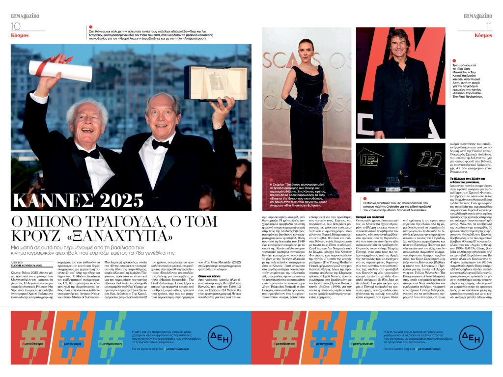 Ακόμα συνομιλούμε με ενδιαφέροντες ανθρώπους που στηρίζουν με πάθος αυτό που κάνουν και έχουν ωραίες ιστορίες να αφηγηθούν: τον ηθοποιό και σκηνοθέτη Αντώνη Αντωνόπουλο, τον δημοσιογράφο και παρουσιαστή του MEGA Νικήτα Κορωνάκη που μιλάει και για το νέο υβριδικό κανάλι MEGA NEWS και την συγγραφέα Ρομένα Μπουζαρόφσκα. τωνΣτο “BHMAGAZINO” μπορείτε επίσης να διαβάσετε για όλα τα σπουδαία που θα συμβούν σύντομα στο λαμπερό κινηματογραφικό Φεστιβάλ των Καννών.