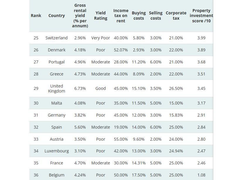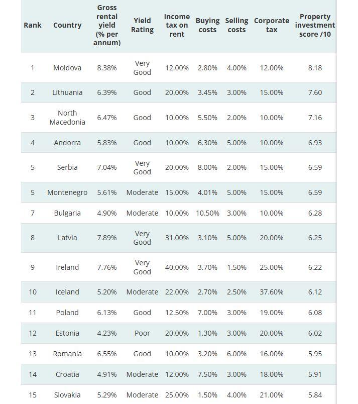 Στις χώρες με τις υψηλότερες ακαθάριστες αποδόσεις ενοικίασης, σε συνδυασμό με σχετικά χαμηλό μέσο φόρο εισοδήματος από ενοίκια, περιλαμβάνονται η Ανδόρα, το Μαυροβούνιο και η Βουλγαρία.